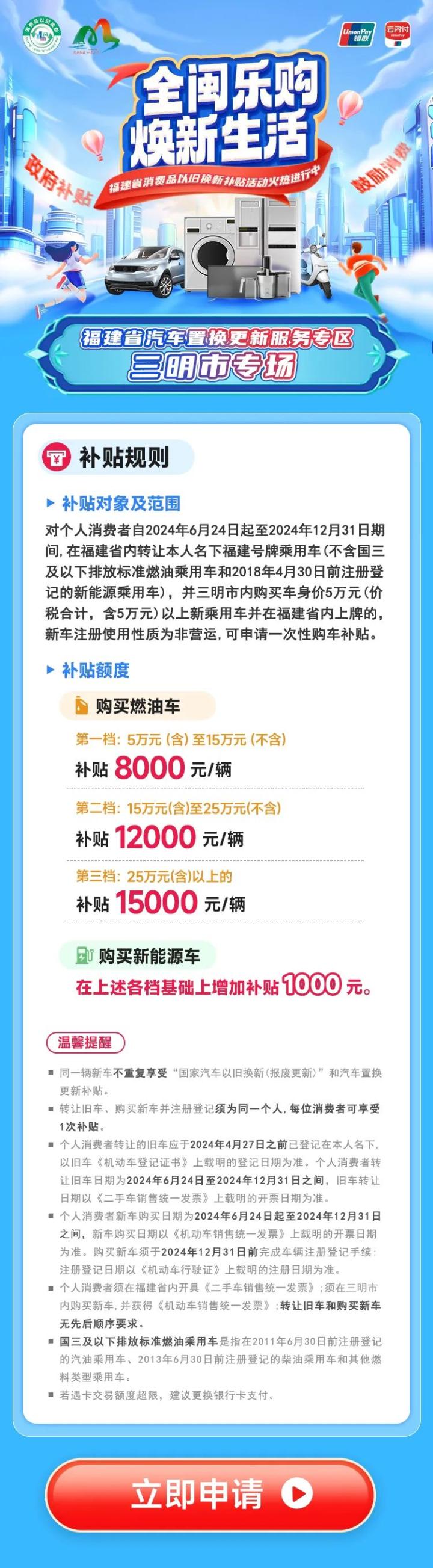 根据《2024年三明市汽车置换更新补贴活动方案》,三明市消费者在2024年6月24日(含)起至2024年12月31日期间,满足条件在三明转让旧车并购买新车的皆可获得一次性购车补贴。根据购买新车的金额设置了8000元至16000元不等的补贴红包。首批安排补贴资金2400万元,后续将根据申报情况和中央国债、省市配套资金总盘进行动态调整,资金总额有限,先到先得,用完即止。除此之外,三明市家电、家装厨卫等领域的换新补贴也将于近期上线。