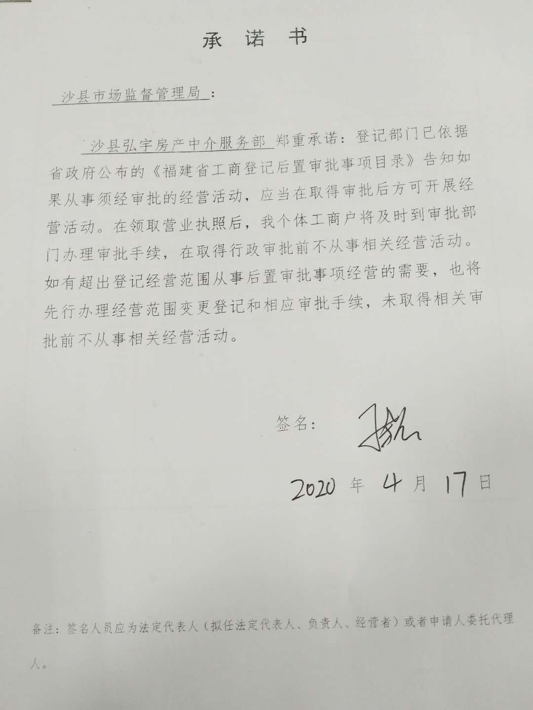 - 2020-04-17 沙县弘宇房产中介服务部承诺