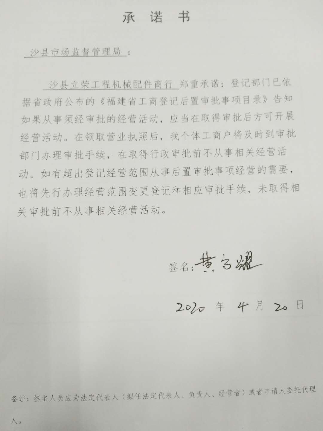 - 2020-04-22 沙县立荣工程机械配件商行承诺