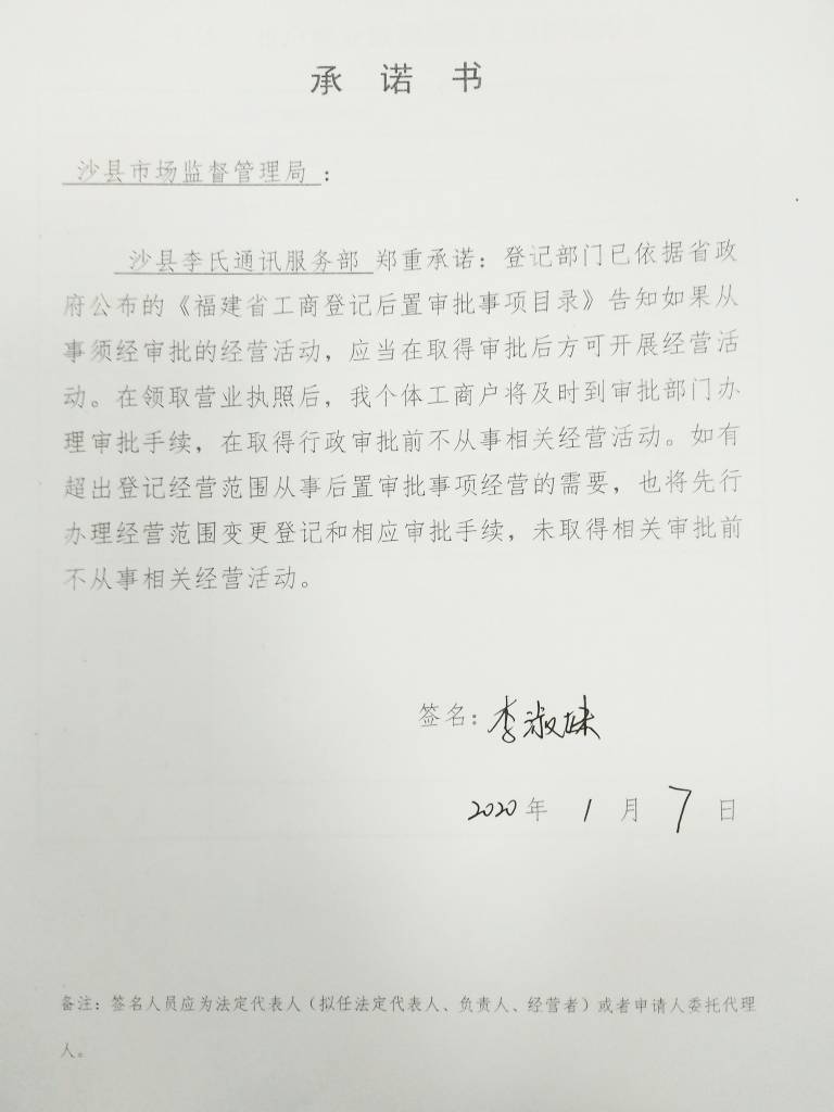 - 2020-02-12 沙县李氏通讯服务部承诺