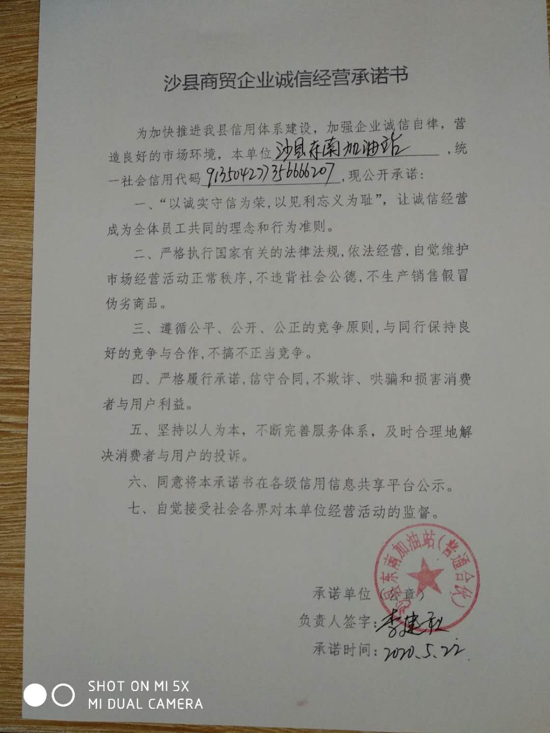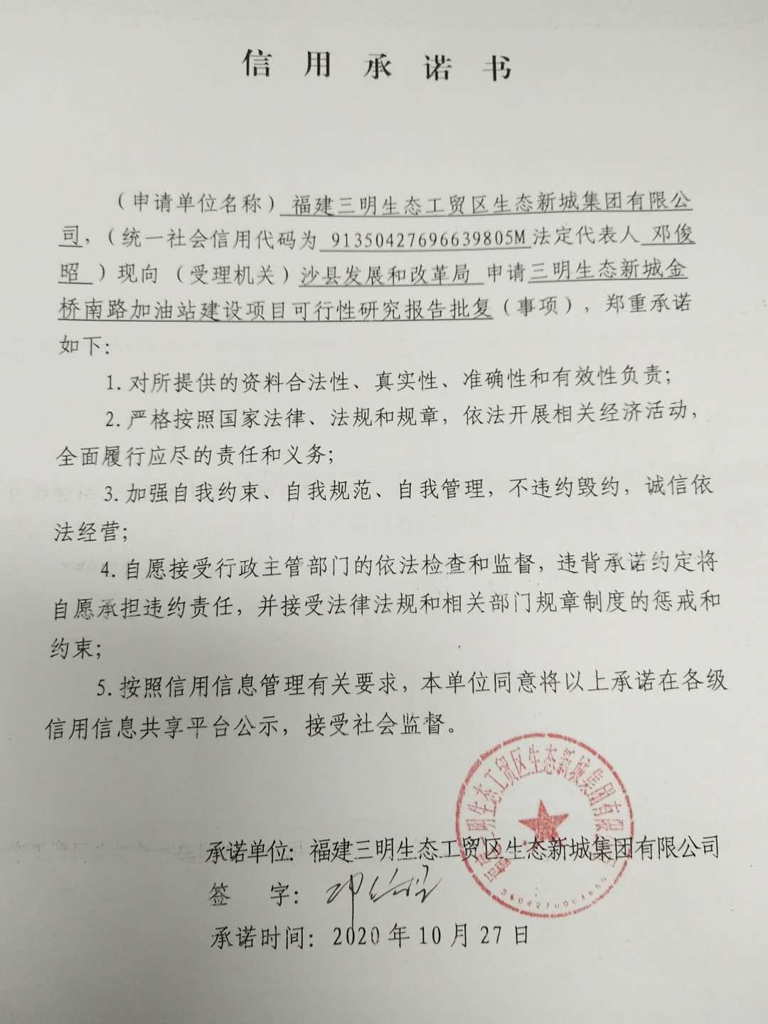 - 2020-05-27 沙县东南加油站承诺