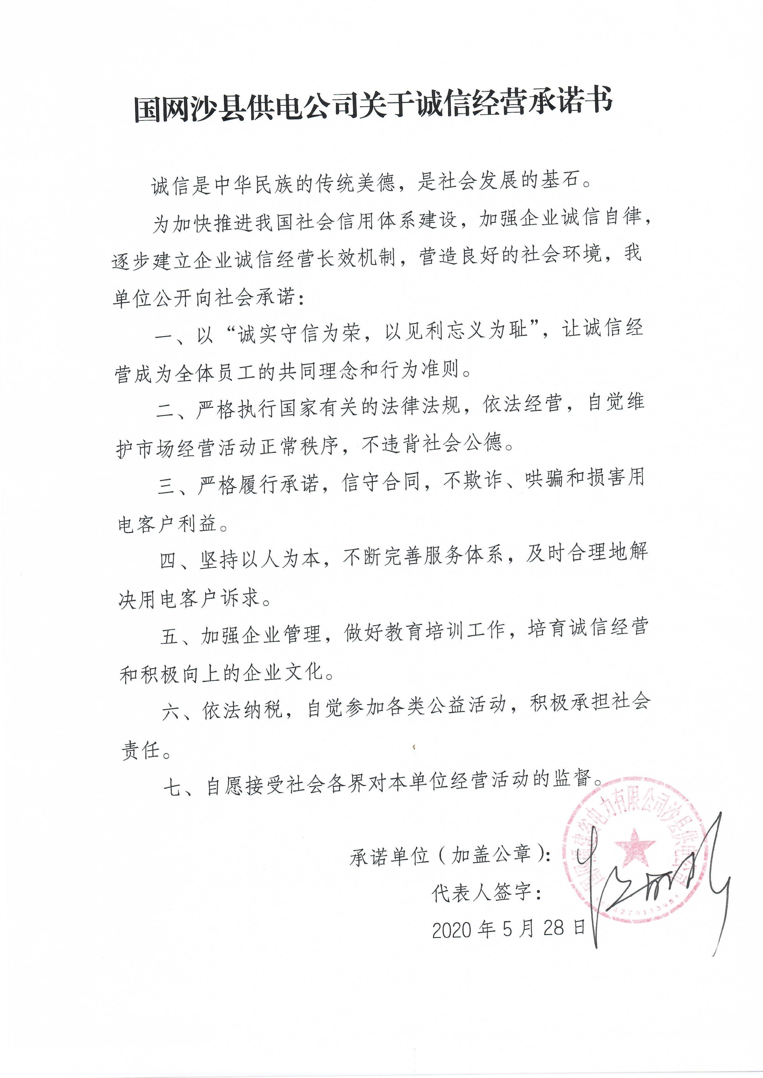- 2020-06-02 国网沙县电力公司承诺