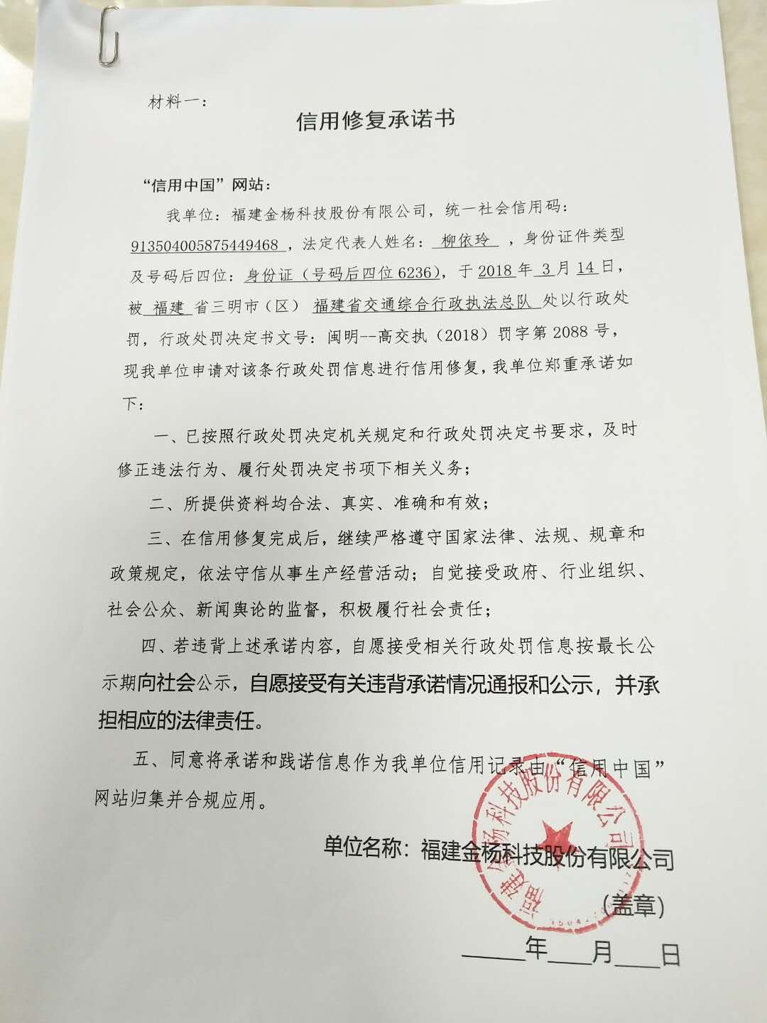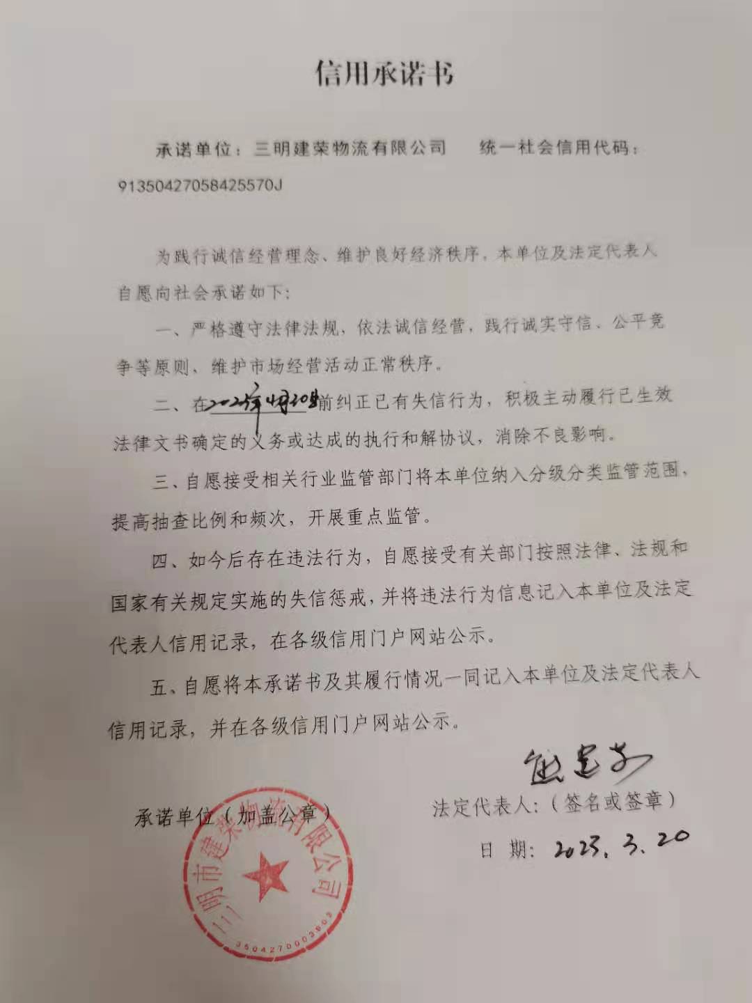 - 2023-03-23 三明市建荣物流有限公司承诺
