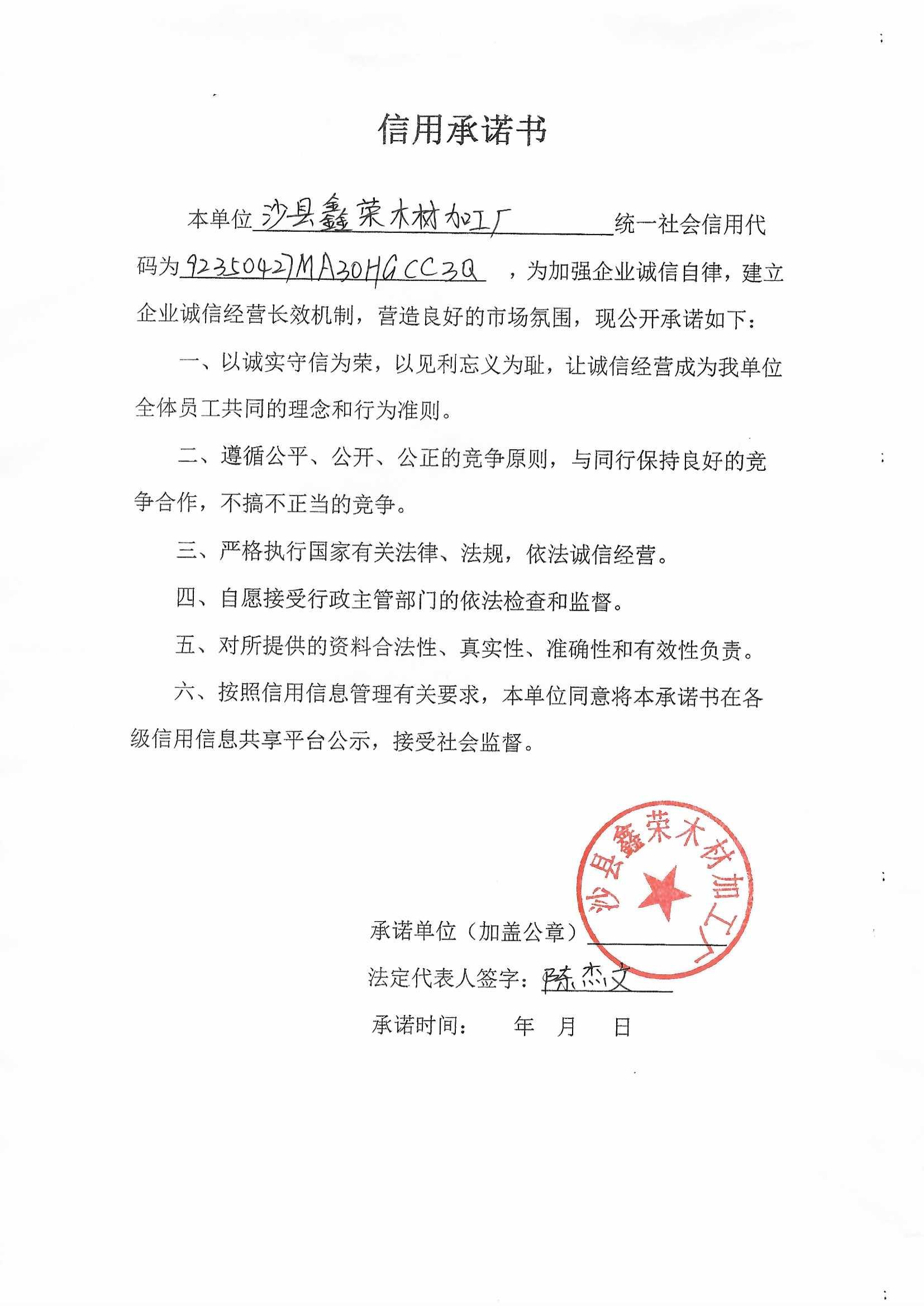 - 2020-12-01 沙县鑫荣木材加工厂承诺