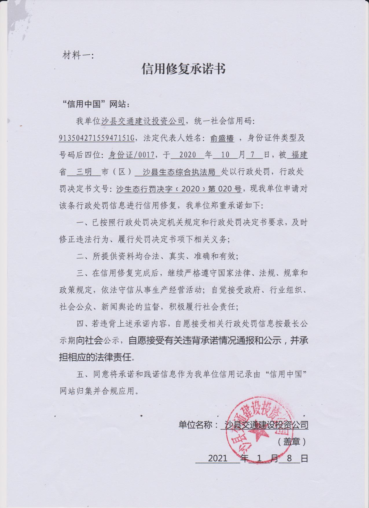 - 2021-01-14 沙县交通建设投资公司承诺