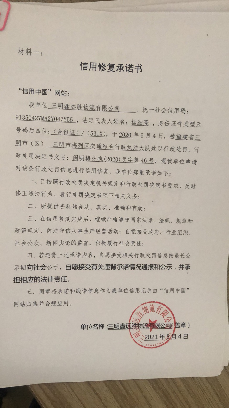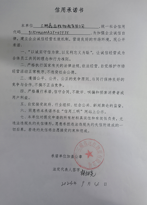 - 2023-09-22 三明鑫远胜物流有限公司承诺