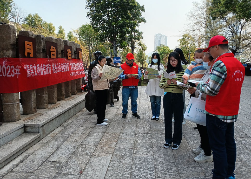 4月9日上午,三明市沙县区文体和旅游局组织志愿者在铁路公园站台开展2023年“倡导文明诚信旅游 推进公民道德建设”文明实践志愿服务活动。