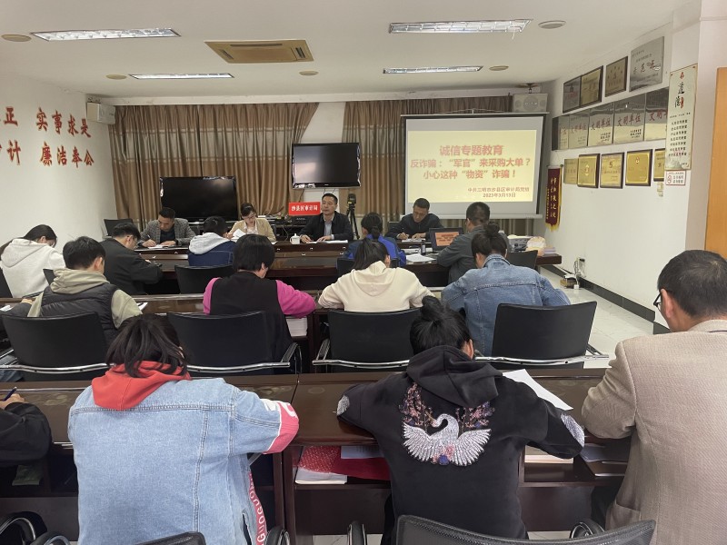 为贯彻落实党中央、国务院关于推动社会信用体系高质量发展的决策部署,进一步践行社会主义核心价值观,引导干部职工自觉践行诚信公约,提高反诈骗警惕性,增强诚信意识。近日,沙县区审计局开展诚信反诈骗专题教育,警示全局干部职工“诚信为本,操守为重”。