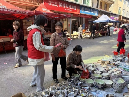 活动当天,工作人员与志愿者组成宣传小队,无需复杂布置,手持贴合节前需求的诚信宣传折页,穿梭在圩场的年货摊、生鲜铺、杂货店、小吃店之间,顺着人流走、围着摊位讲,以面对面沟通、点对点宣讲的方式,让诚信宣传融入赶圩备年的日常,既不影响商户经营,也不打扰村民采购,务实又入心。