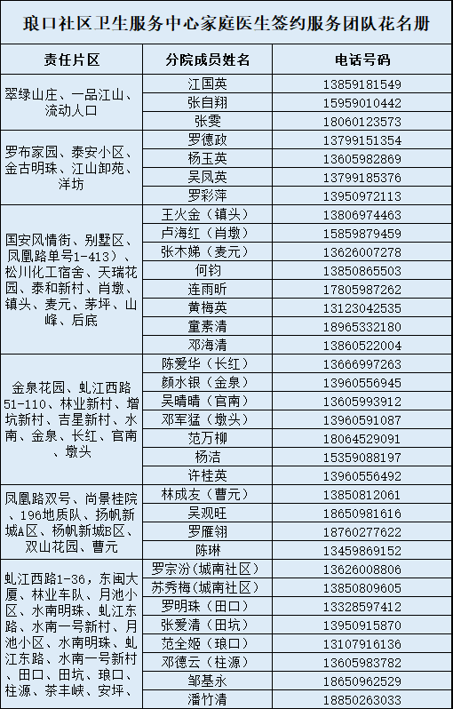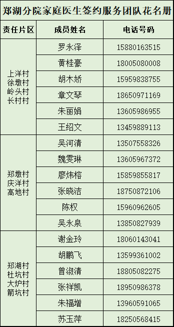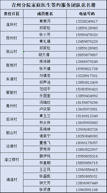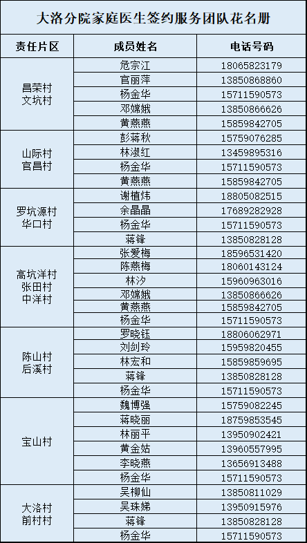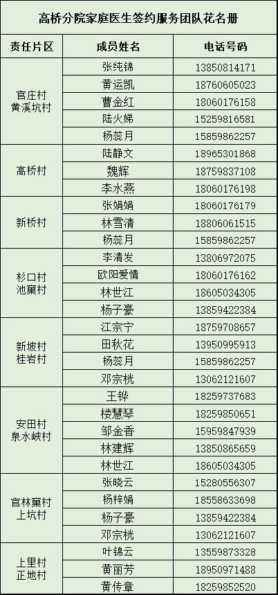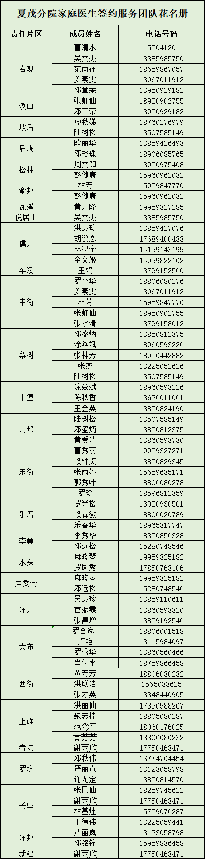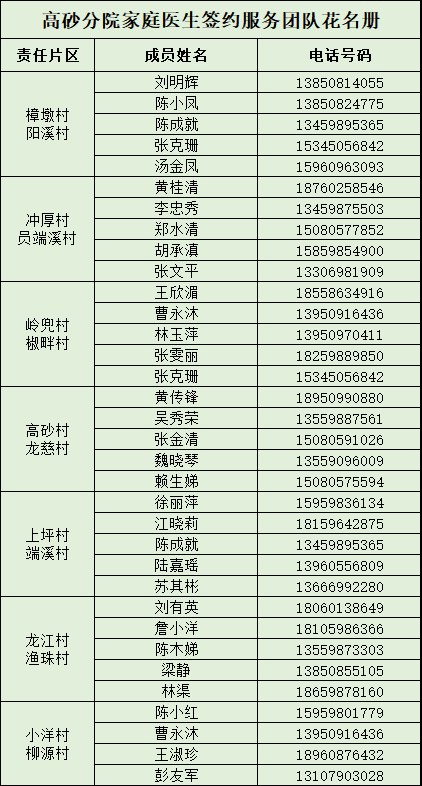 沙县区12个乡(镇、街道)家庭医生联系方式