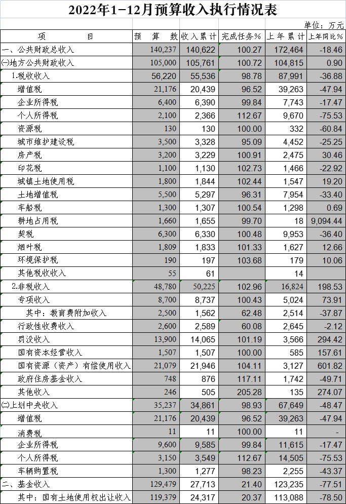 2022年1-12月预算收入执行情况