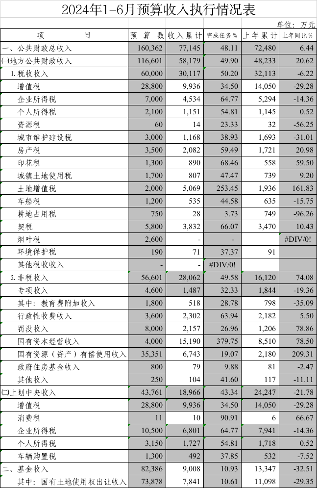 2024年1-6月预算收入执行情况