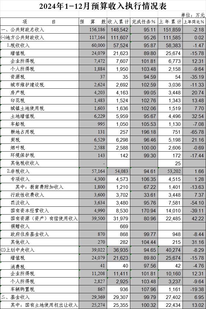 2024年1-12月预算收入执行情况