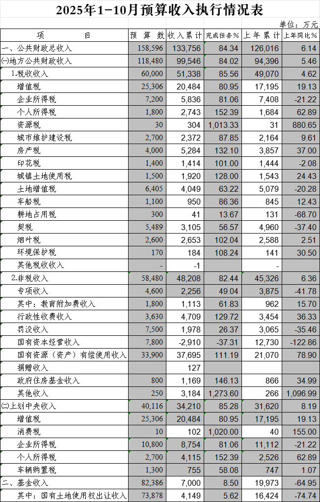 2025年1-10月预算收入执行情况