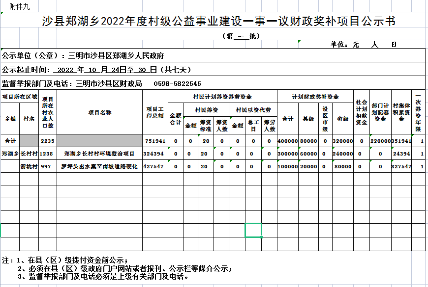 沙县郑湖乡2022年度村级公益事业建设一事一议财政奖补项目公示书