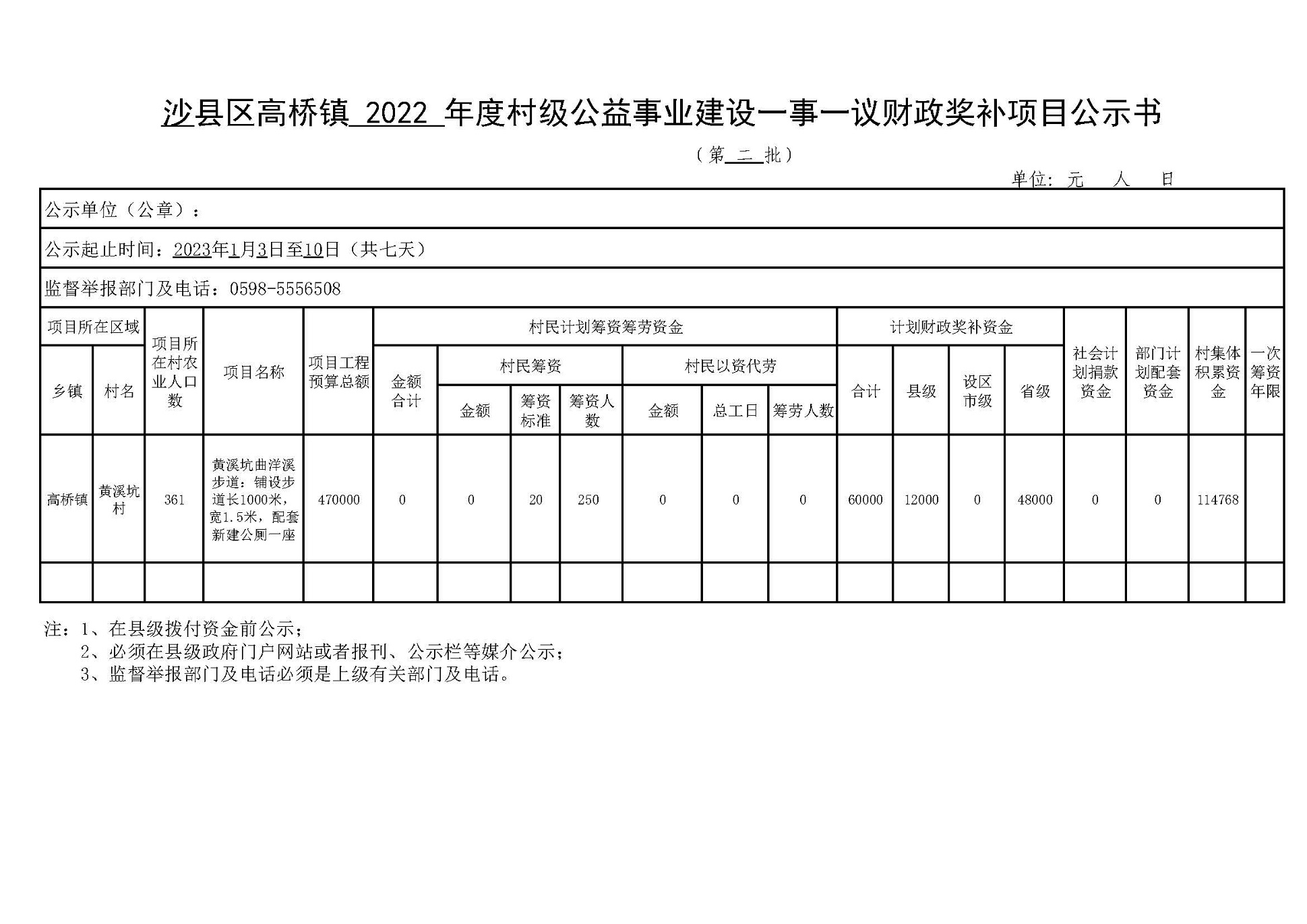 沙县区高桥镇2022年度村级公益事业建设一事一议财政奖补项目公示书