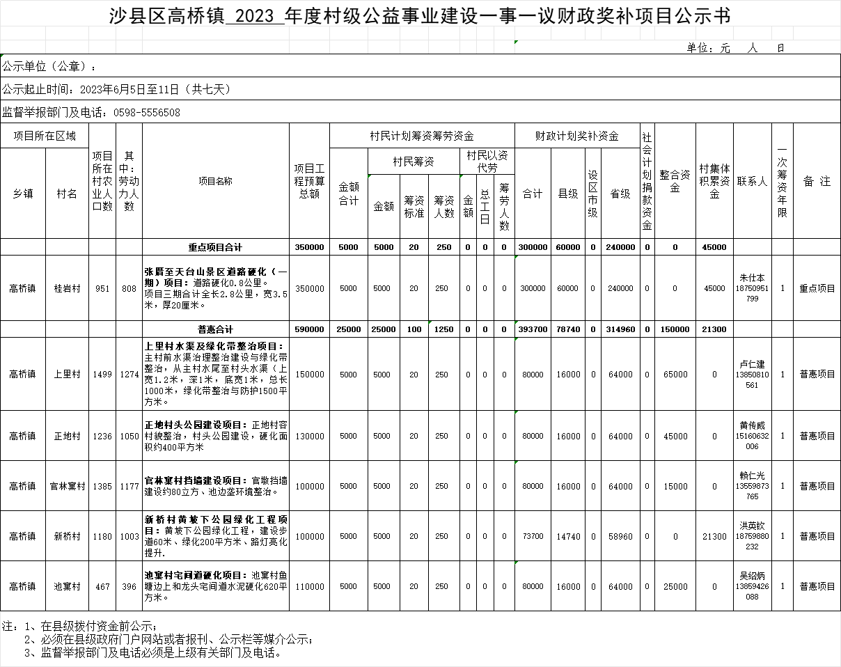 沙县区高桥镇2023年度村级公益事业建设一事一议财政奖补项目公示书