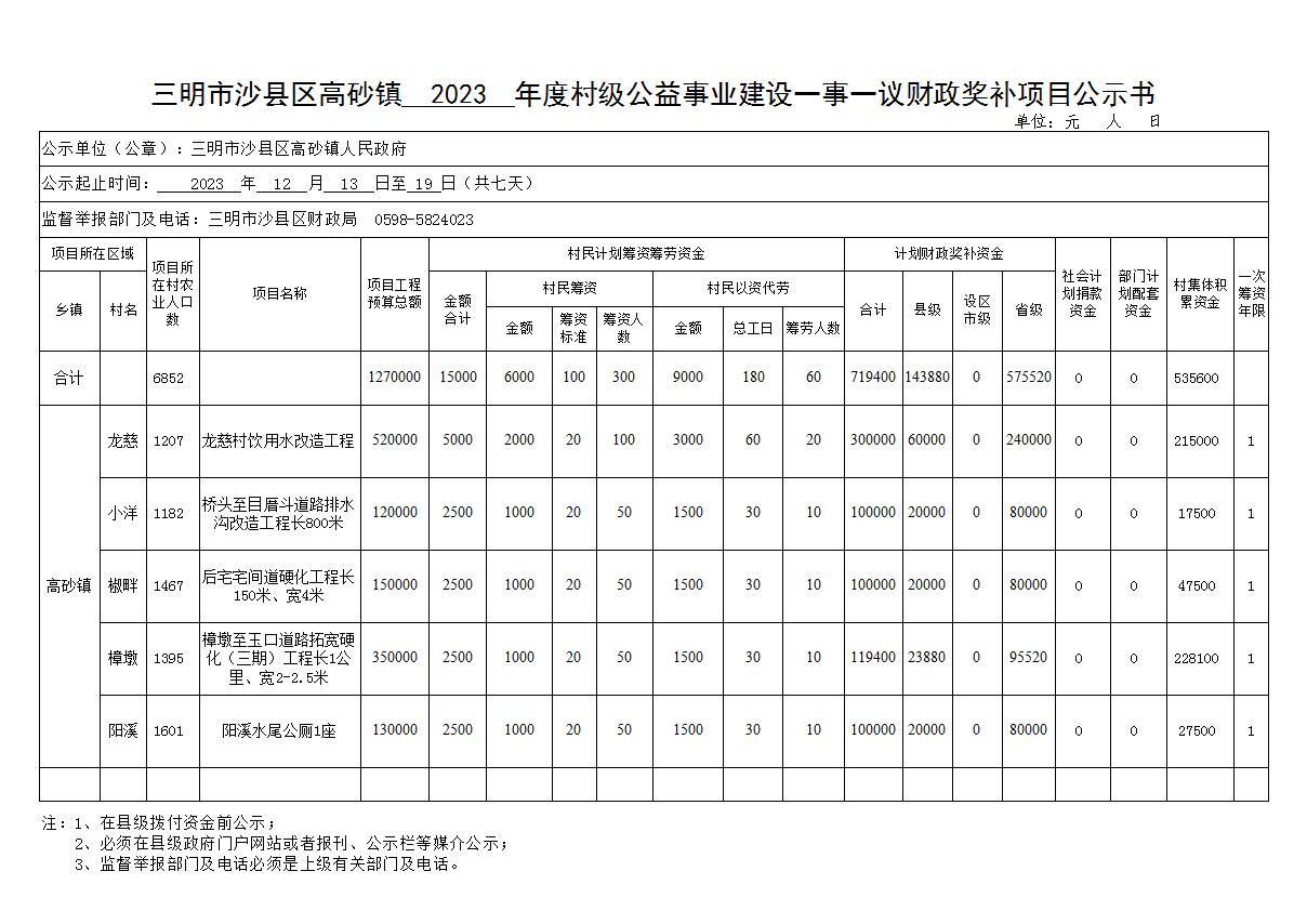三明市沙县区高砂镇2023年度村级公益事业建设一事一议财政奖补项目公示书