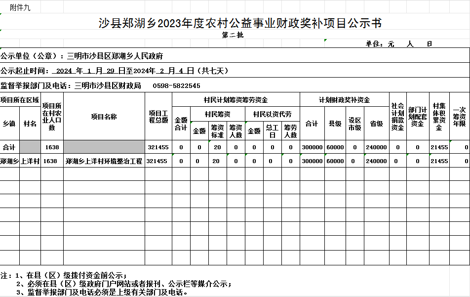 沙县郑湖乡2023年度农村公益事业财政奖补项目公示书(第二批)
