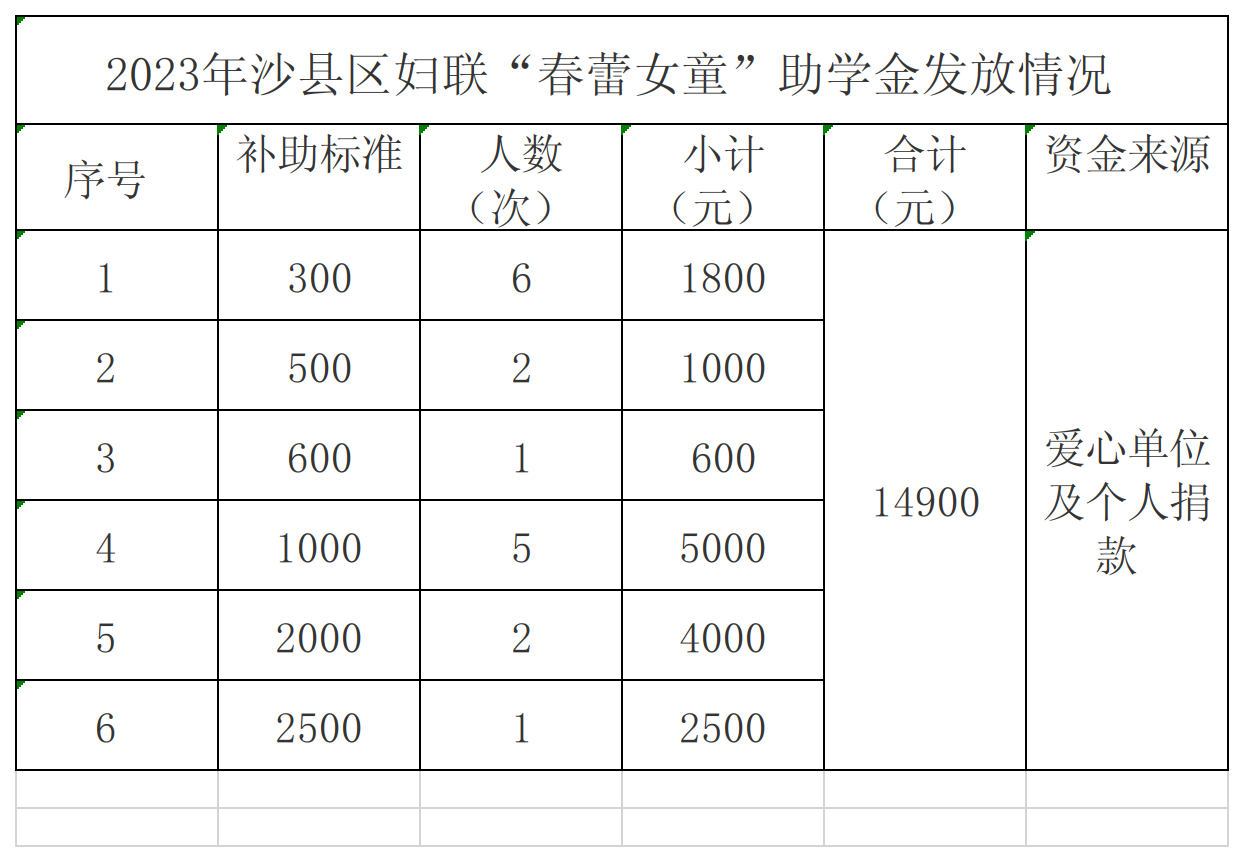 2023年沙县区妇联“春蕾女童”助学金发放情况汇总