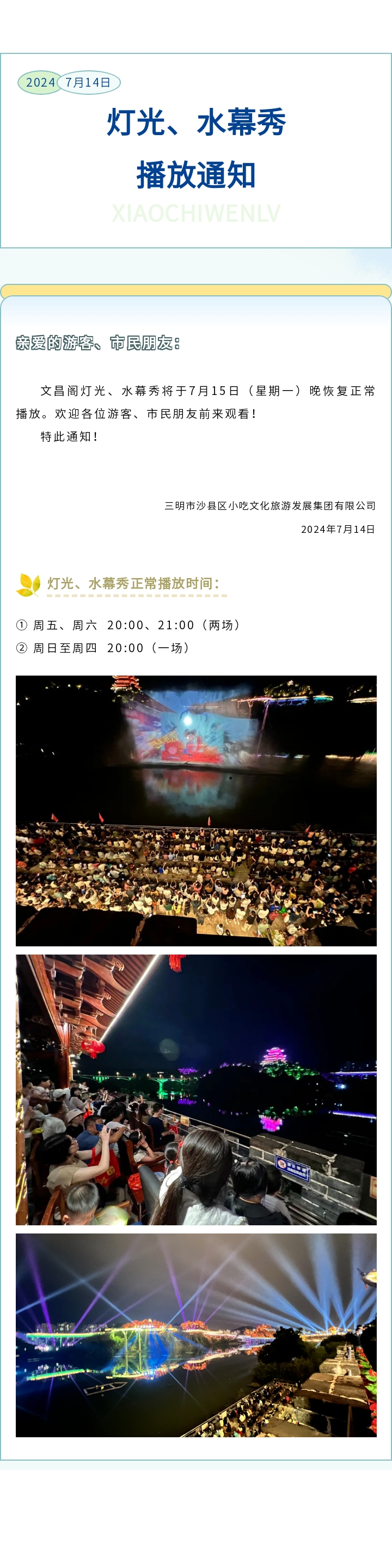关于文昌阁灯光、水幕秀恢复正常播放的通知
