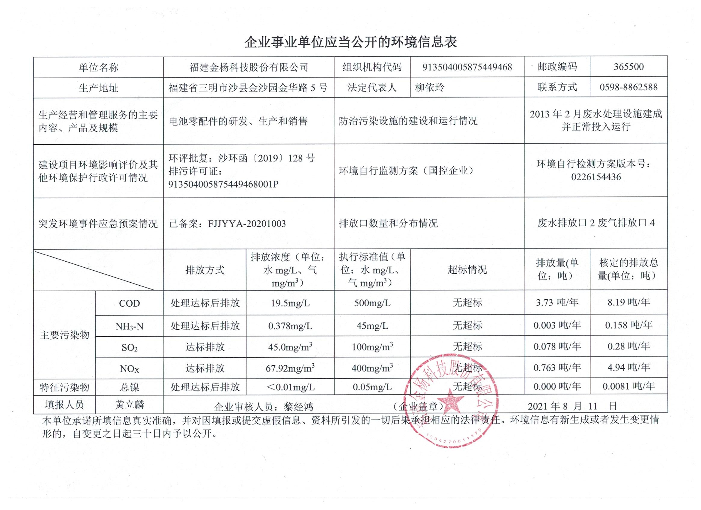 - 2021-09-07 福建金杨科技股份有限公司应公开的环境信息表
