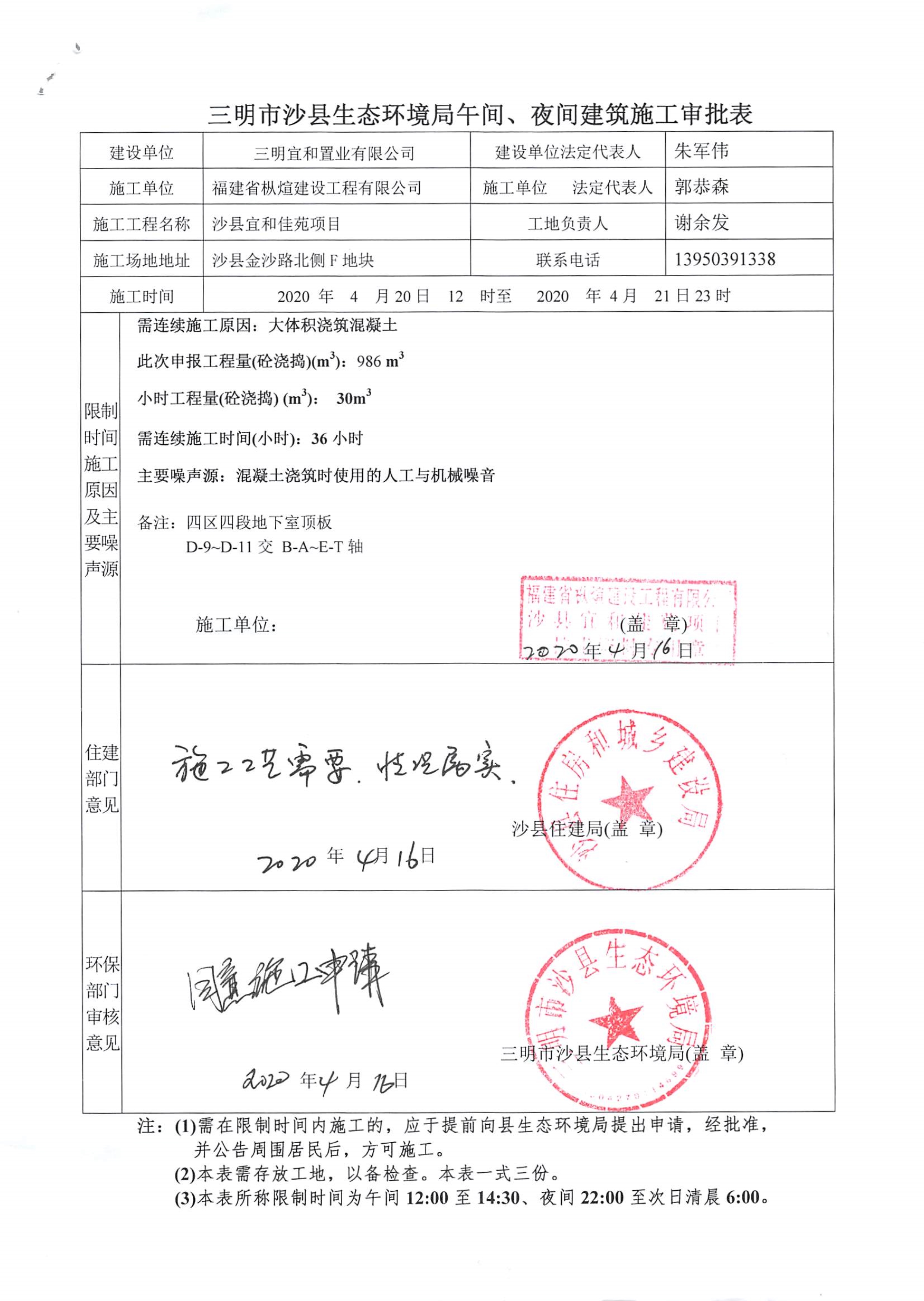 三明市沙县生态环境局关于2020年4月20日午夜间施工审批的公告