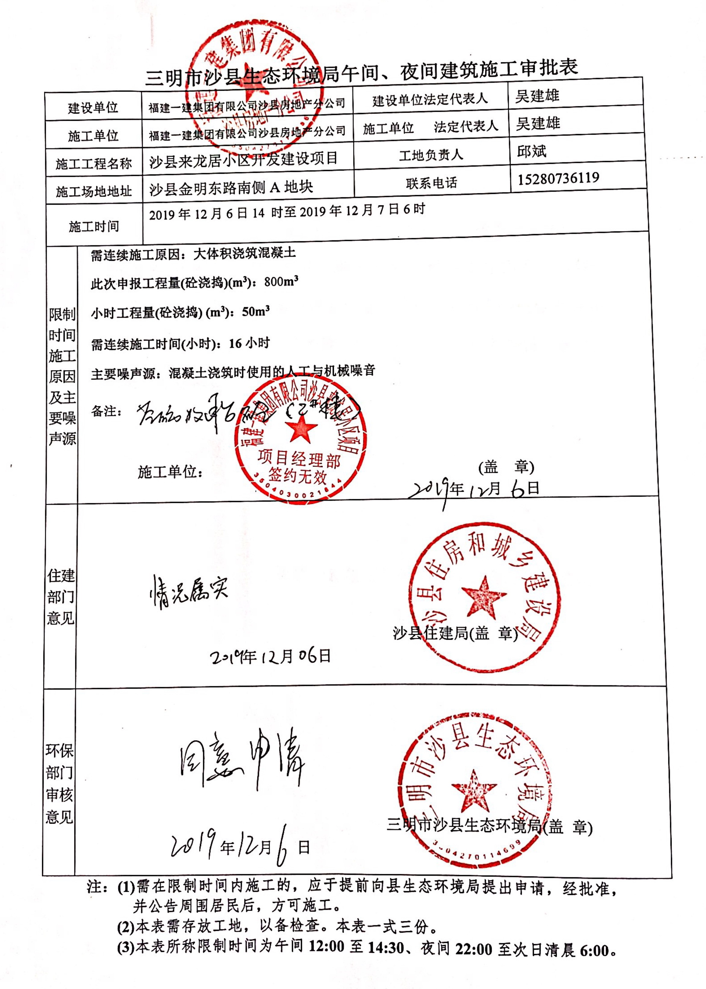 三明市沙县生态环境局关于2019年12月6日午夜间施工审批的公告