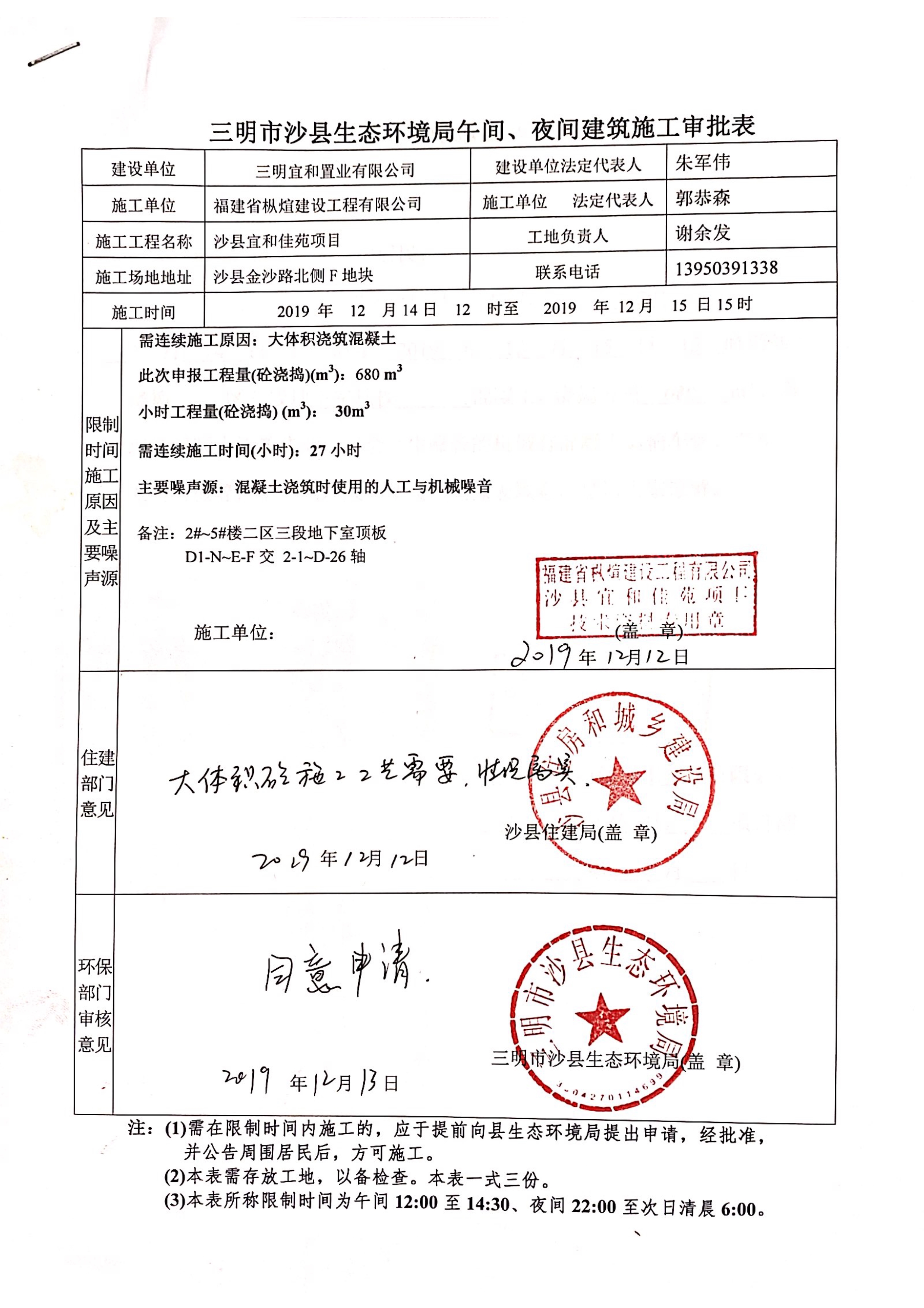 三明市沙县生态环境局关于2019年12月14日午夜间施工审批的公告