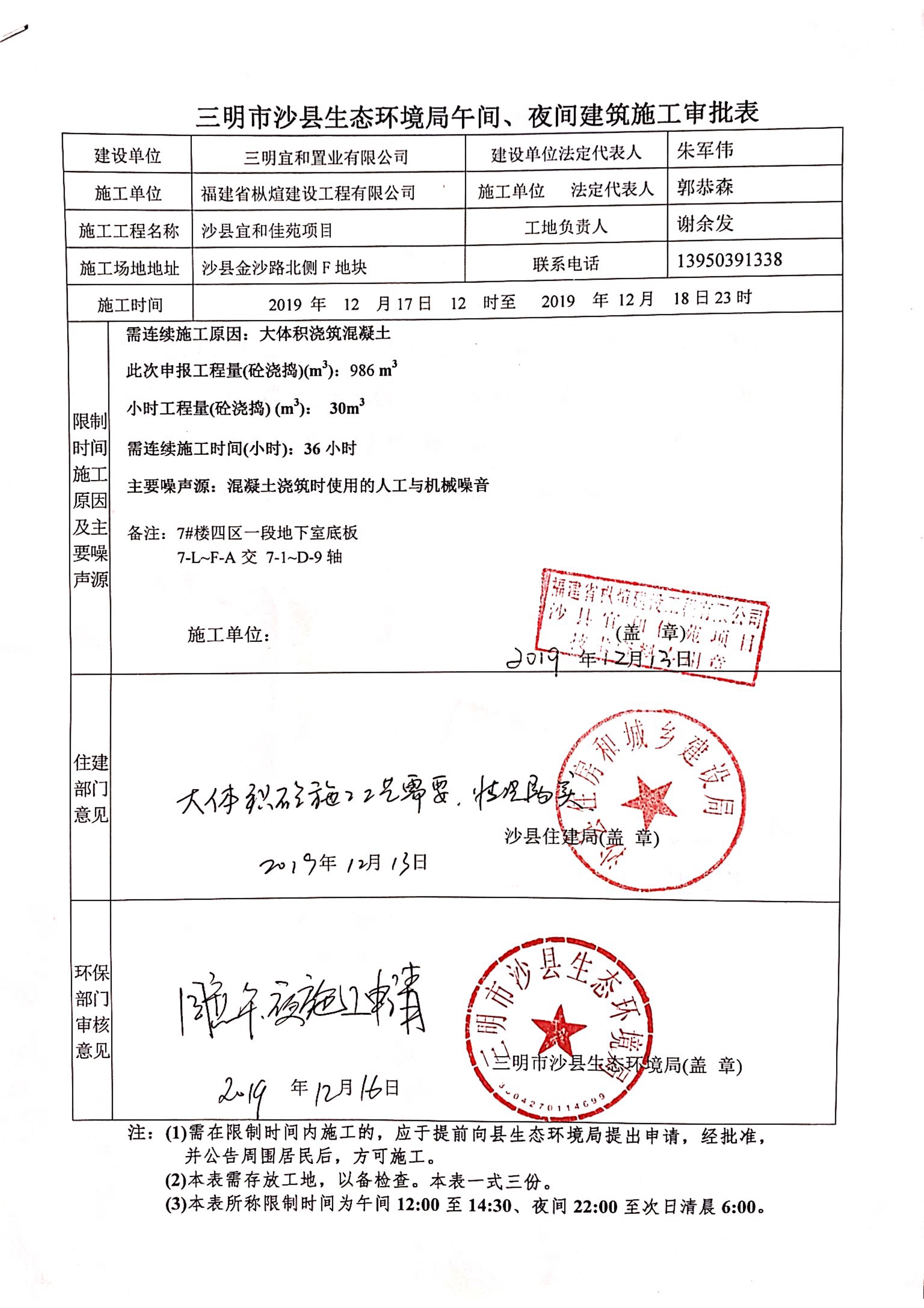 三明市沙县生态环境局关于2019年12月17日午夜间施工审批的公告