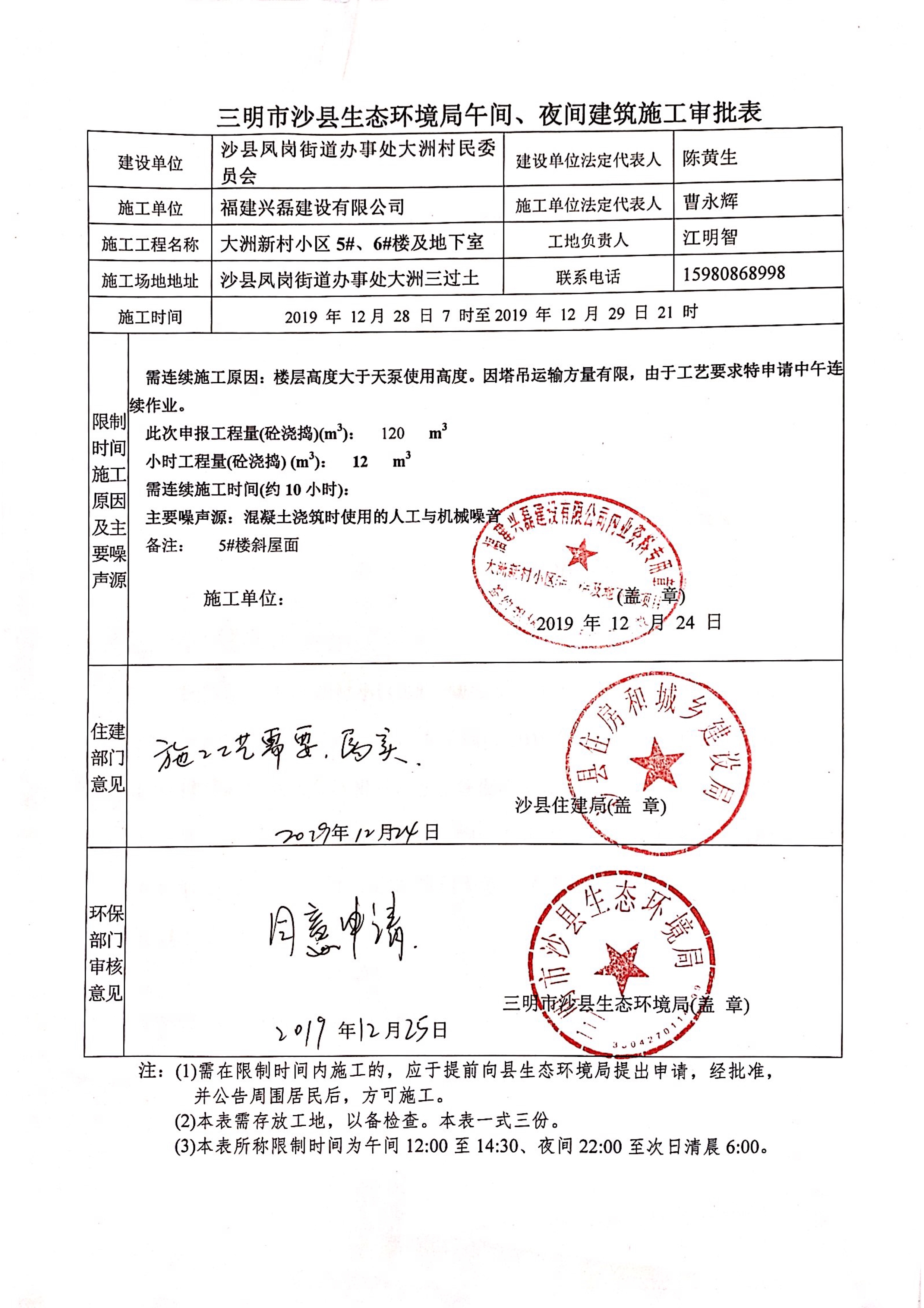 三明市沙县生态环境局关于2019年12月28日午夜间施工审批的公告