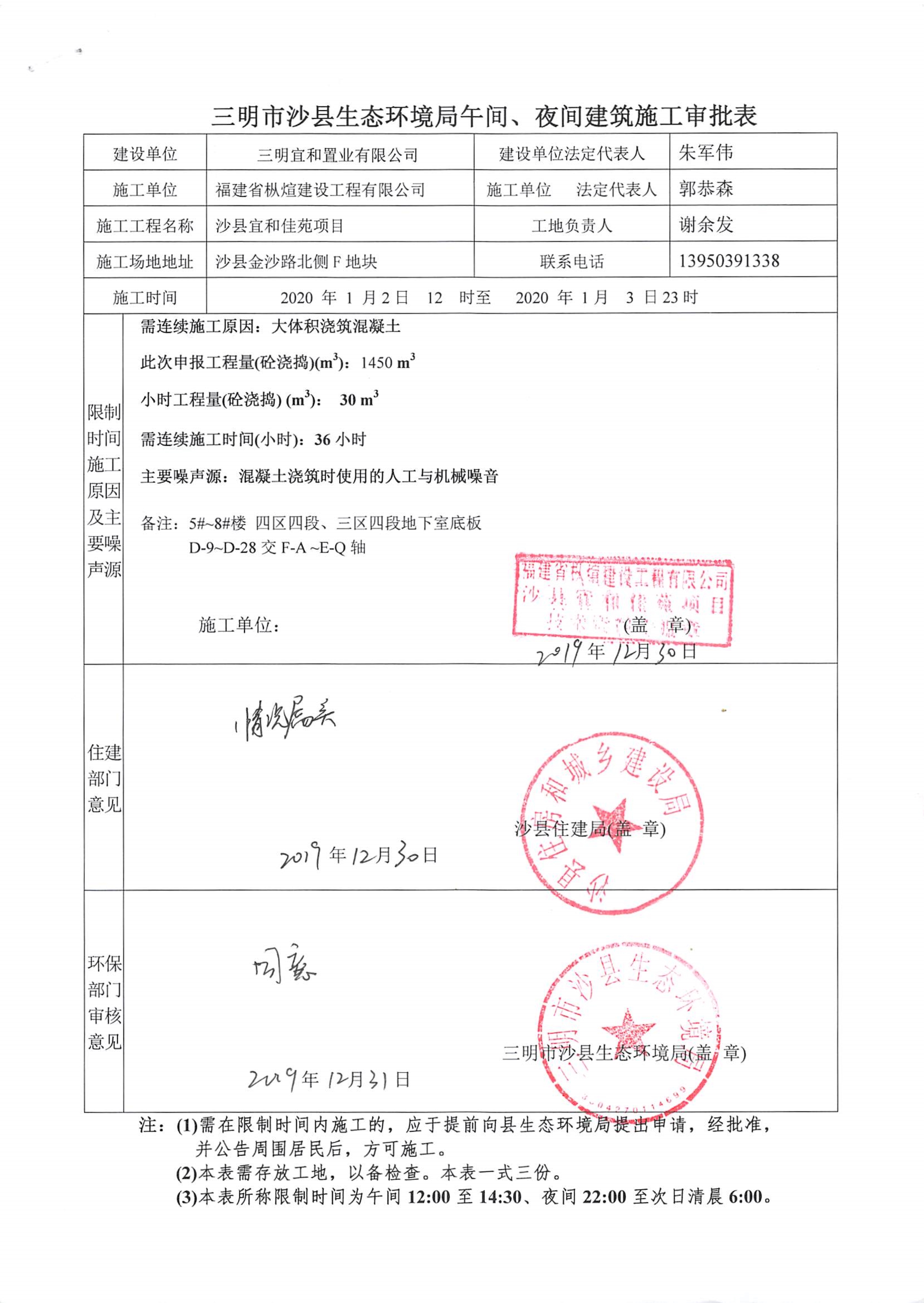 三明市沙县生态环境局关于2020年1月2日午夜间施工审批的公告
