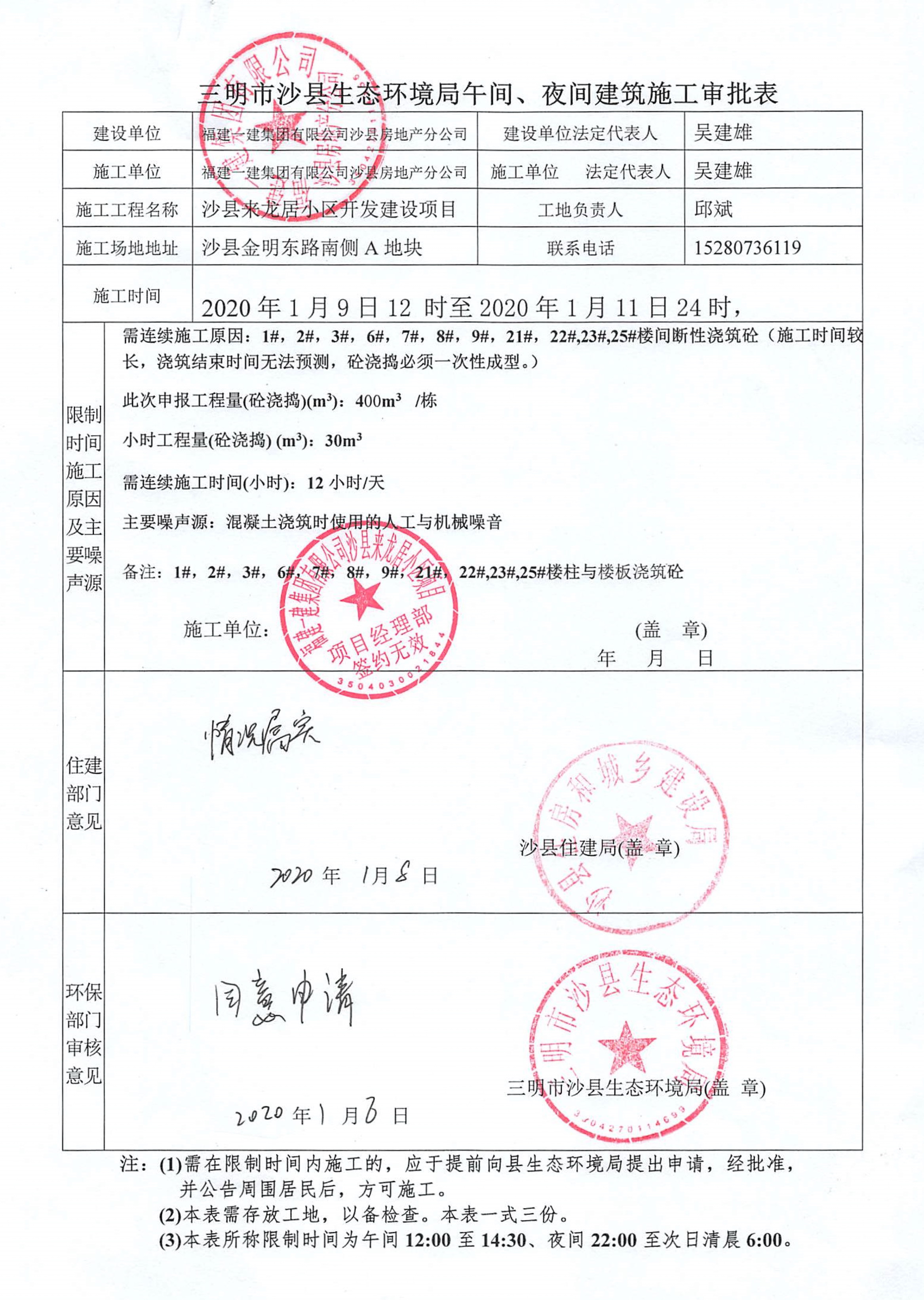 三明市沙县生态环境局关于2020年1月9日午夜间施工审批的公告