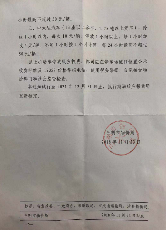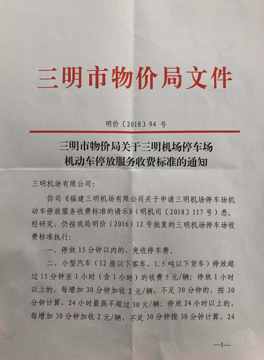 三明市物价局关于三明机场停车场机动车停放服务收费标准的通知