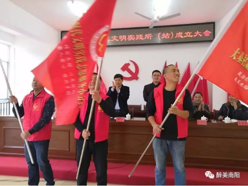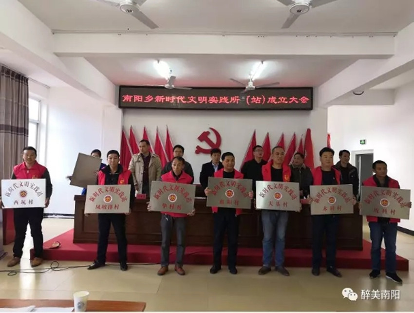 揭牌仪式上,乡党委书记杨军、乡长詹先辉、乡党委副书记刘靖宇、副乡长钟丽丽共同为南阳乡新时代文明实践所、南阳乡新时代文明实践志愿服务队揭牌;乡党政班子成员向8个行政村新时代文明实践站授牌、7支新时代文明实践志愿服务小分队授旗。