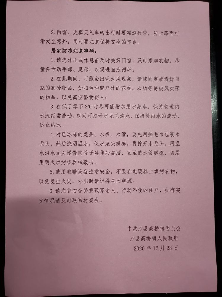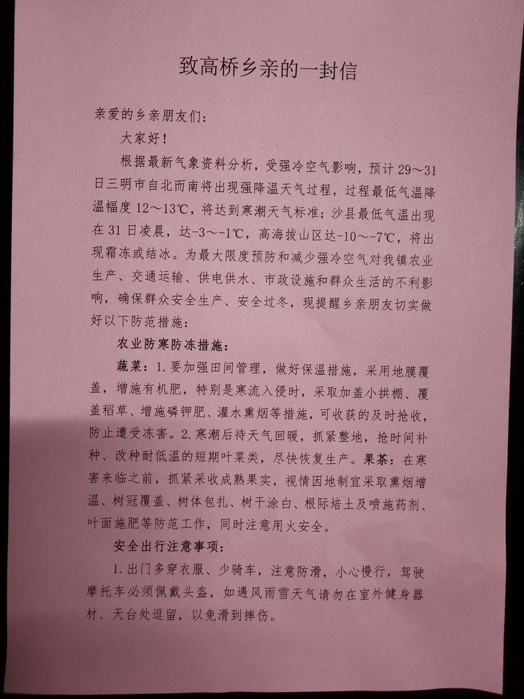 二是加强宣传,提前预警到位。组织挂包村干部下沉到村入户,发放防寒防冻《致村民的一份信》共计1000余份,让群众全面知晓寒潮情况和注意事项,做到未雨绸缪。