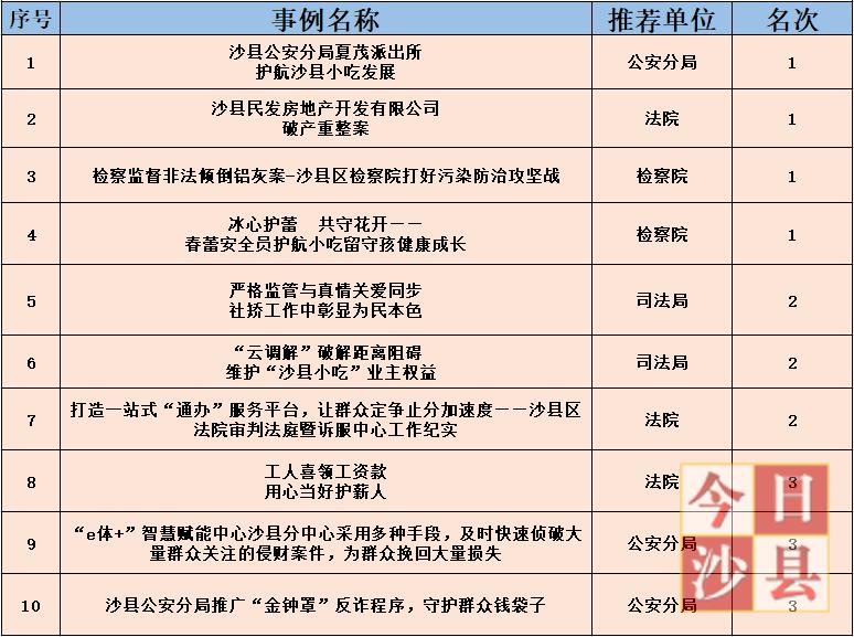经过前期的评审,沙县区政法系统“双十佳”评选活动圆满结束,“政法干警为群众办实事十佳事例”评选结果正式出炉。