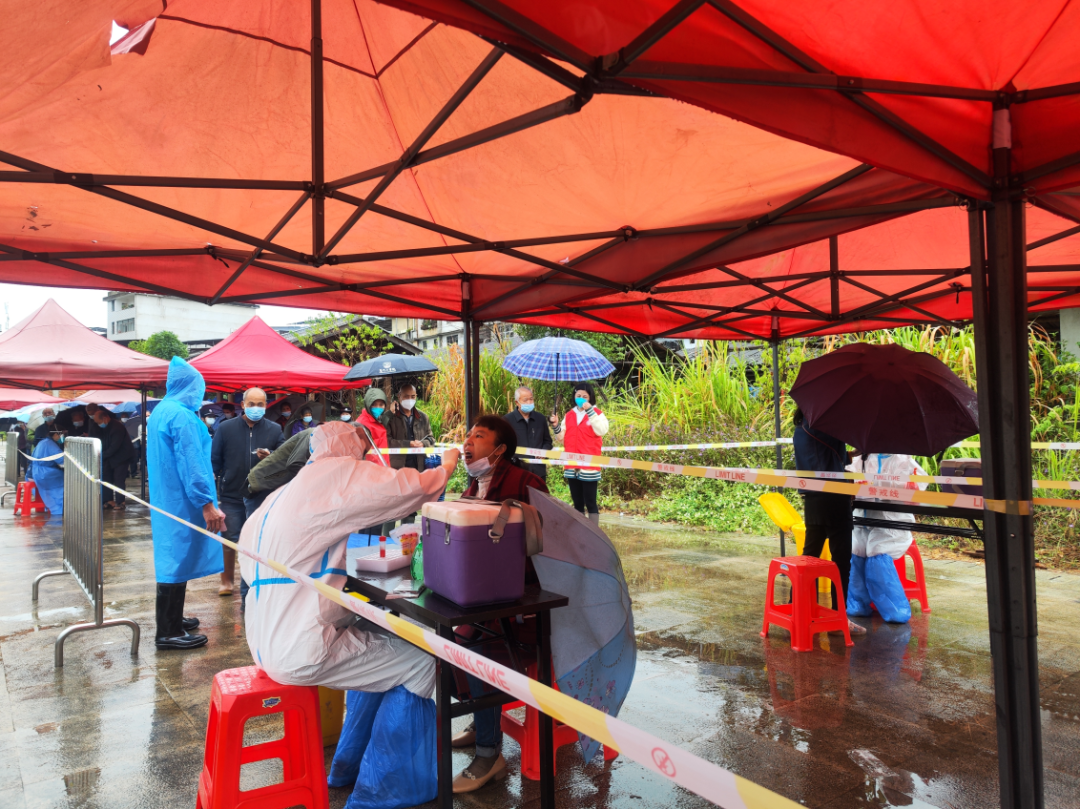 下午1点,演练开始了。群众在工作人员的引导下佩戴好口罩,按照一米线的距离排队,有序进行测温、登记、采样等工作。