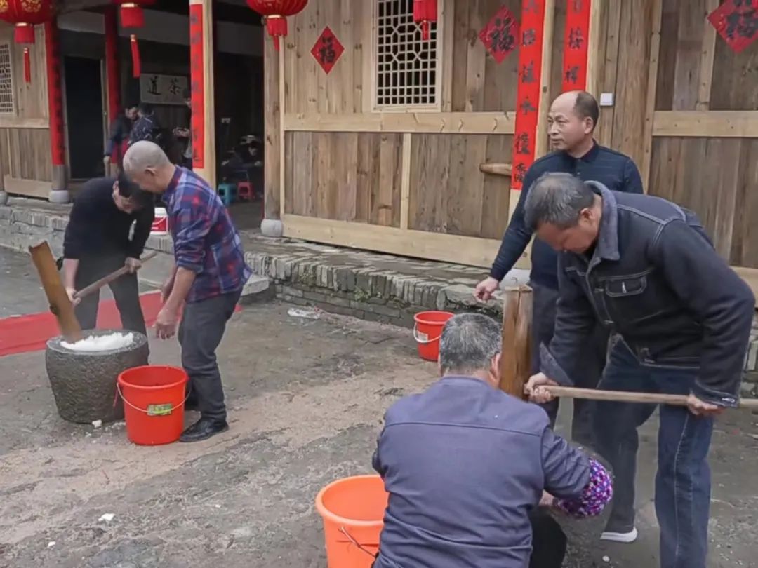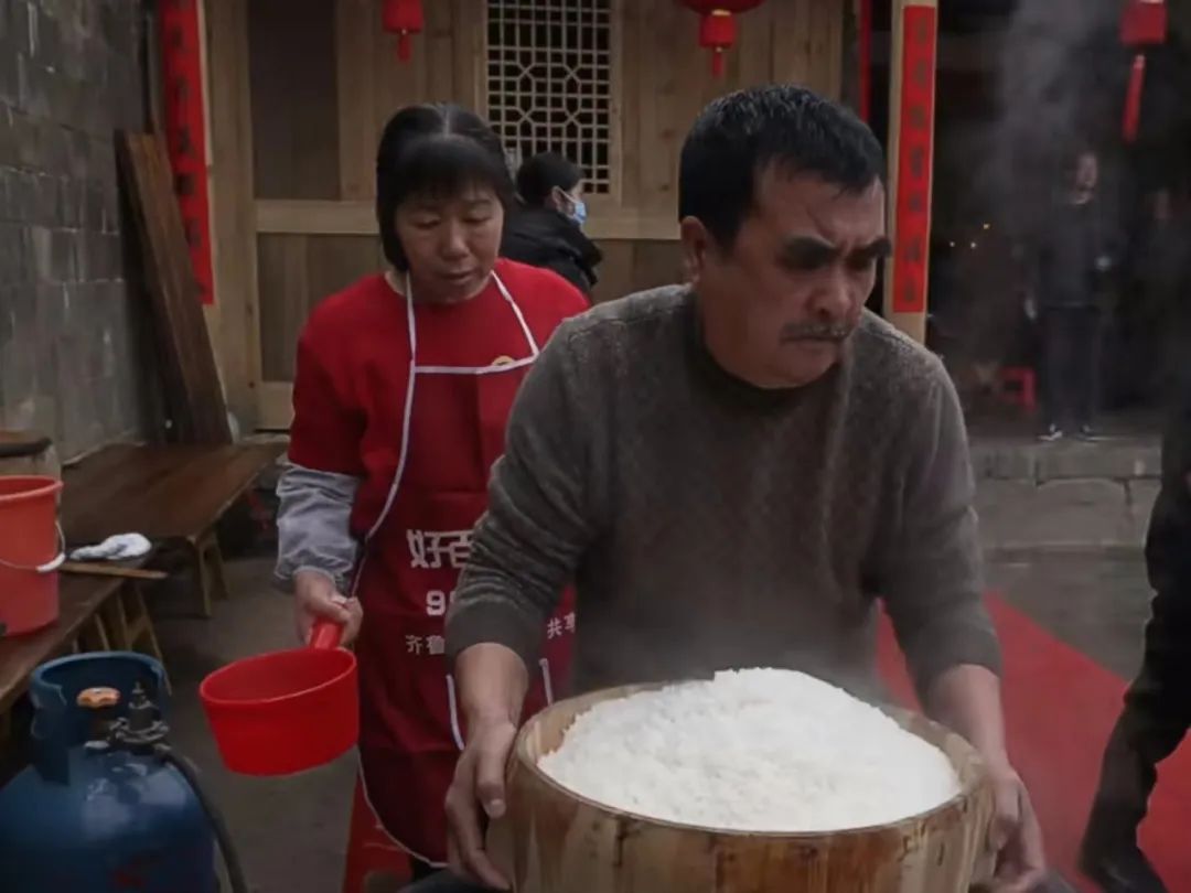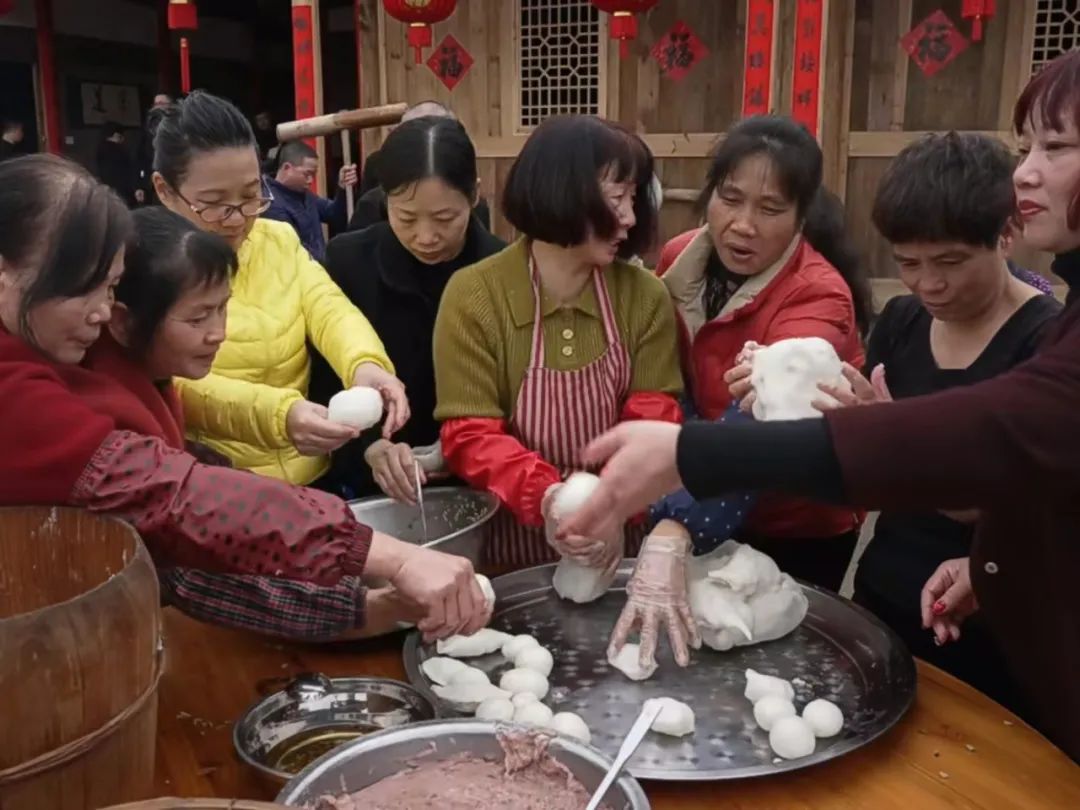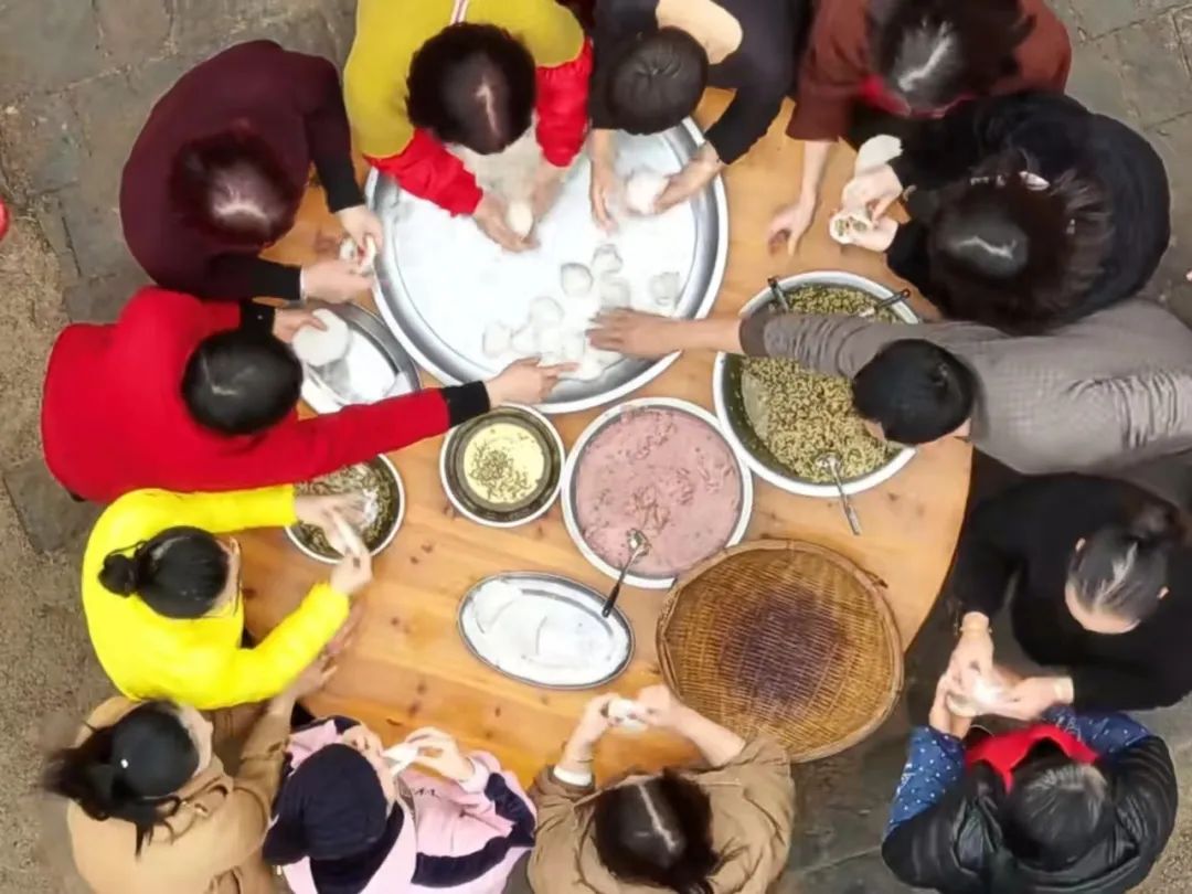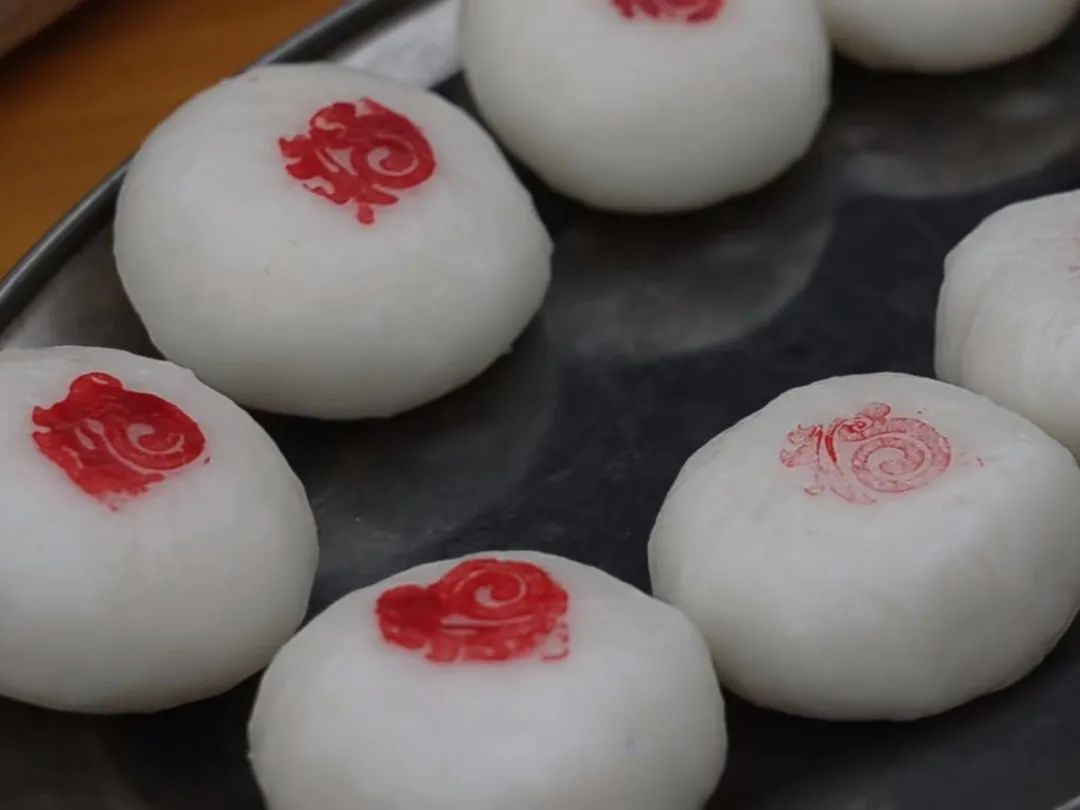 蒸新米、打白粿、包馅料、拓福印,Q弹圆润的米粿在村民的接力中制作完成,蘸料也由简至丰,由从前的酱油水、芋泥演变为肉馅,映衬着村民们日益丰盈的美好生活。