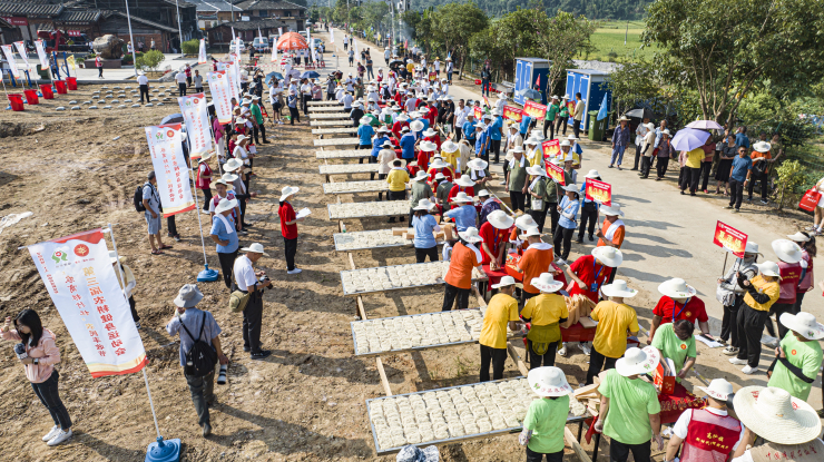 特产快收 运动员们头戴草帽,纷纷化身流水线工人,将高砂镇特色农产品——高砂面干打包装箱。