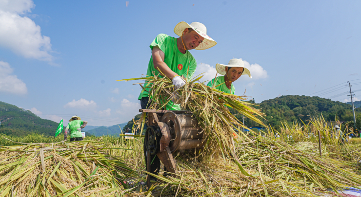 稻谷收割 运动员们挥舞着镰刀、脚踩打谷机,在金黄色的稻田里,体验收割稻谷和打谷,感受农耕生活的辛苦和乐趣。