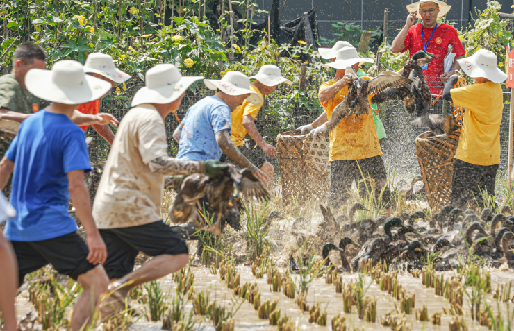 稻田抓鸭 随着裁判员一声令下,万众期待的稻田抓鸭活动正式开始,泥水飞溅、人鸭混战,不少抓鸭达人大显身手。“这里!快抓!”、“这边还有鸭子!”场外观众的呼喊声在稻田里此起彼伏。