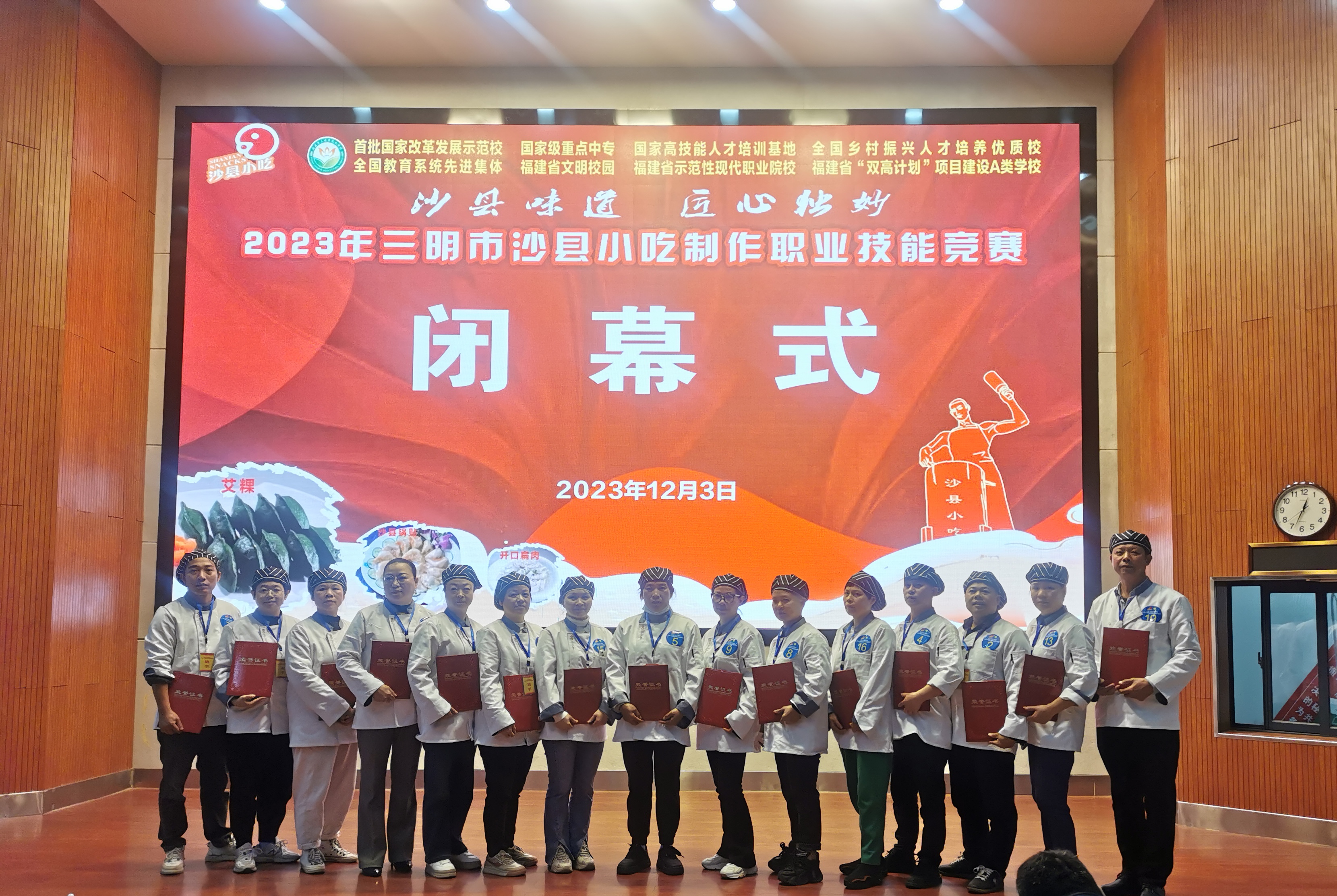 闭幕会上,三明市人社局副局长陈永连、三明市总工会副主席张素梅、沙县区政协副主席谢荣年、三明农校校长罗世钦分别为选手们颁发了奖状,为一等奖选手颁发了“三明市技术能手”和“三明市五一劳动奖章”荣誉证书,沙县小吃制作职业技能竞赛至此圆满结束。