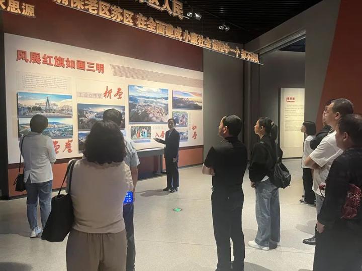 在三明市博物馆内,讲解员带领党员干部们先后参观了“红旗飘飘”“红旗漫卷”“红旗不倒”“红旗领航”4个展区,馆内通过虚拟现实技术、3D影像等呈现方式,讲述三明的革命先辈的英雄事迹,展现了三明中央苏区的历史变迁。