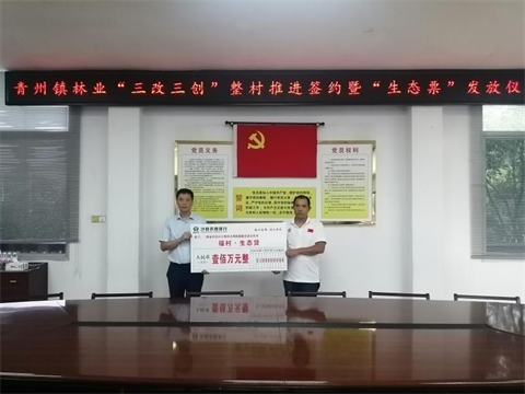 发放仪式现场,青州村、溪坪村分别与区森林资源收储管理有限公司进行了“三改三创”整村推进签约,合计天然林生态林经营权流转1514亩,获得区农商银行“福村·生态贷”授信150万元。