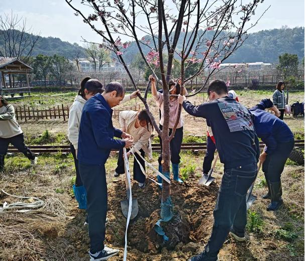 活动现场,党员们热情高涨、干劲十足,迅速投入到植树活动中。大家三人一组、五人一群,分工协作,配合默契,有的挥锹铲土,有的扶苗填坑,有的踏土夯苗,各个环节衔接有序,每道工序都认真细致。经过辛勤劳作,樱花树树苗在俞邦村“安家落户”,一排排新栽树苗昂然挺立,在春日里展现出勃勃生机。