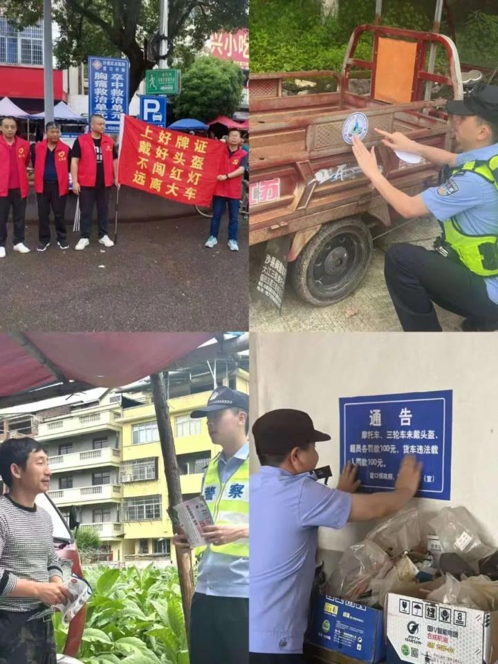 利用“五一”返乡、圩日等时段,富口镇道安办联合派出所、交通劝导员等组建宣传动员队伍,在集镇街区、乐龄学堂等场所向村民详细讲解三轮摩托车违法载人、摩托车不佩戴头盔等交通违法行为的严重危害,并针对烟农进行重点宣传;组织劝导员对三轮车、摩托车等张贴“喝酒不骑车、骑行戴头盔”提示标识卡;利用“村村通”广播每天早、中、晚固定播报路况和安全提醒信息,切实提高村民的交通安全意识。
