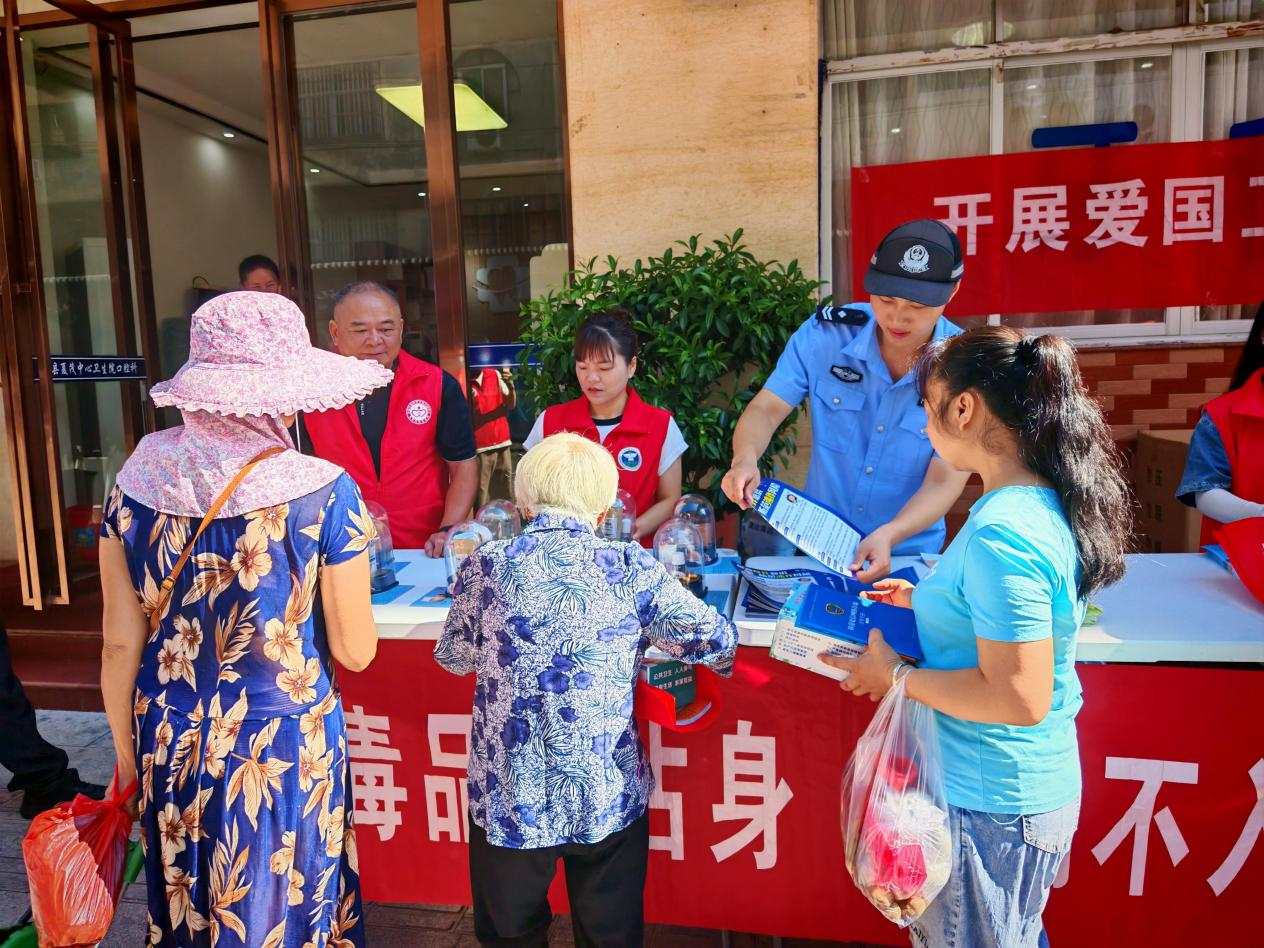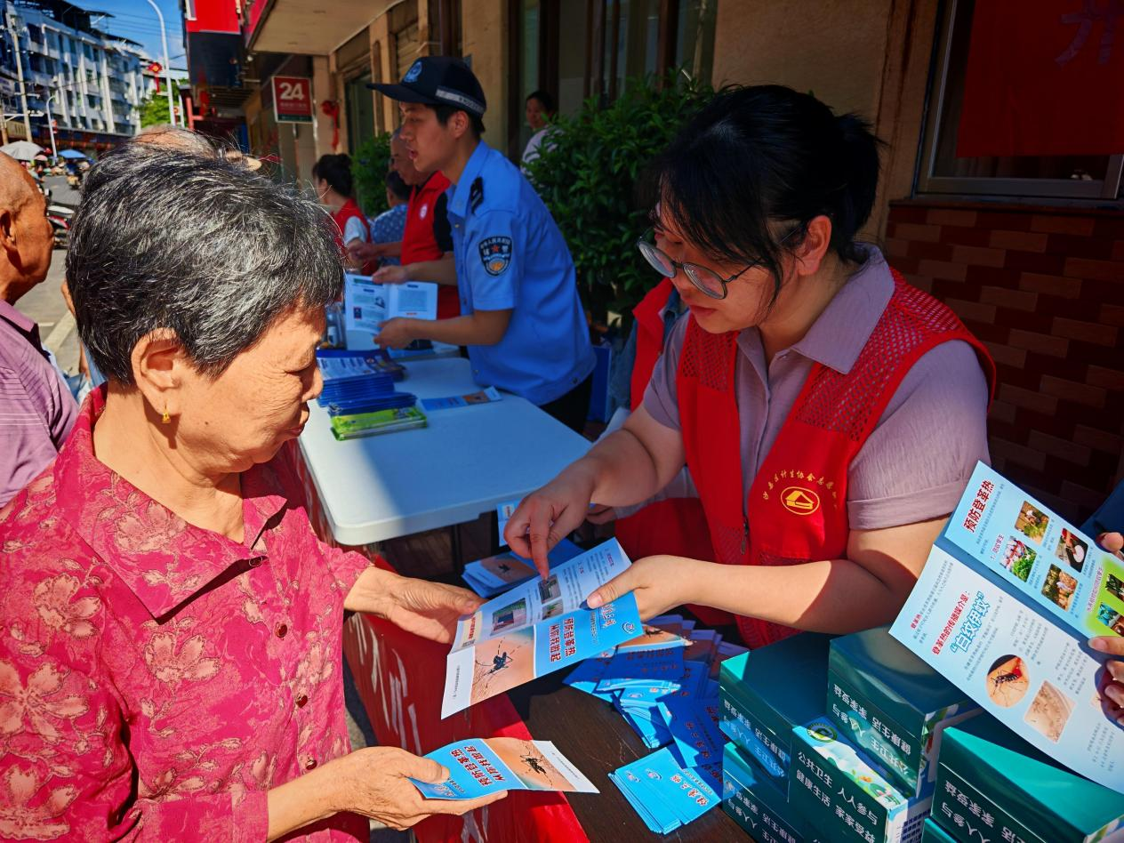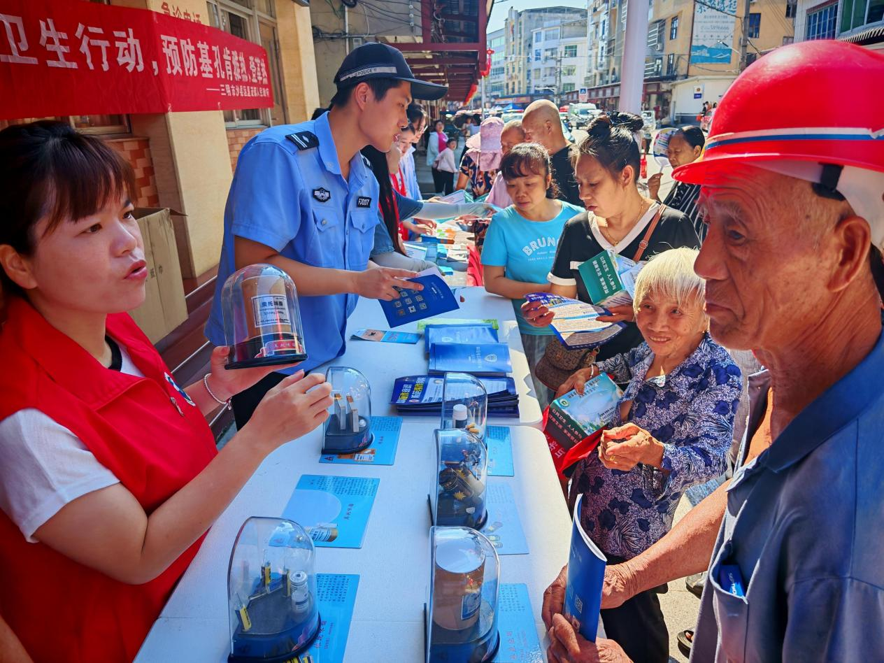 活动现场,各部门结合职能精准发力,让宣传既有“干货”又接地气。禁毒志愿者向群众展示了9余种仿真毒品模型,揭秘新型毒品伪装;派出所民警用身边案例拆解“冒充客服退款、刷单返利”套路,手把手指导群众安装“国家反诈中心”APP,让大家在互动中掌握防骗口诀;爱国卫生志愿者现场讲解预防基孔肯雅热、登革热相关知识,演示如何识别伊蚊孳生地,提醒群众“清积水、灭蚊虫、防叮咬”;医保工作人员一边发放医保宣传折页,一边为群众解答2026年度参保、异地就医、慢特病认定等内容;司法所工作人员向群众发放民法典及小吃业主普法等宣传册,提高群众安全防范意识。