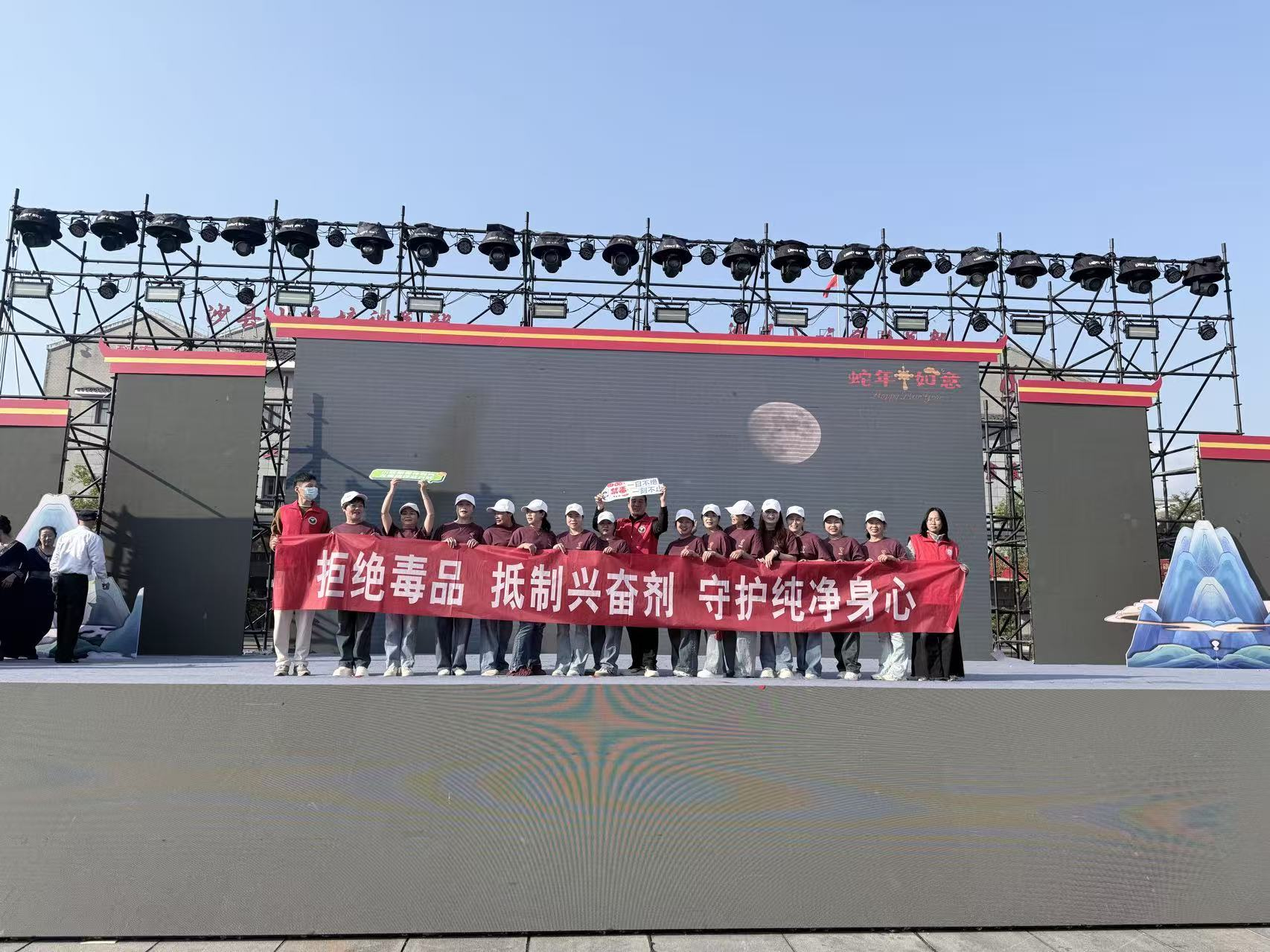 高桥镇志愿者还在主舞台拉起“拒绝毒品 抵制兴奋剂 守护纯净身心”的横幅。同时,开展禁毒知识互动问答活动,吸引了群众驻足观看并参与其中,大家在趣味比拼中牢记防毒要点。