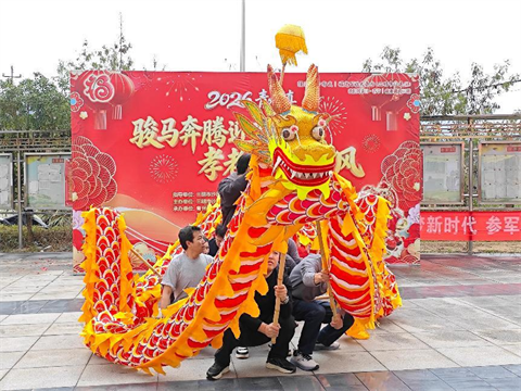 老人们围坐一旁,兴致勃勃地观赏表演,脸上洋溢着幸福满足的笑容。精彩的舞龙桥段引得大家阵阵喝彩,现场欢声笑语不断,既增添了节日的热闹氛围,也让老人们感受到浓浓的关怀与温情。